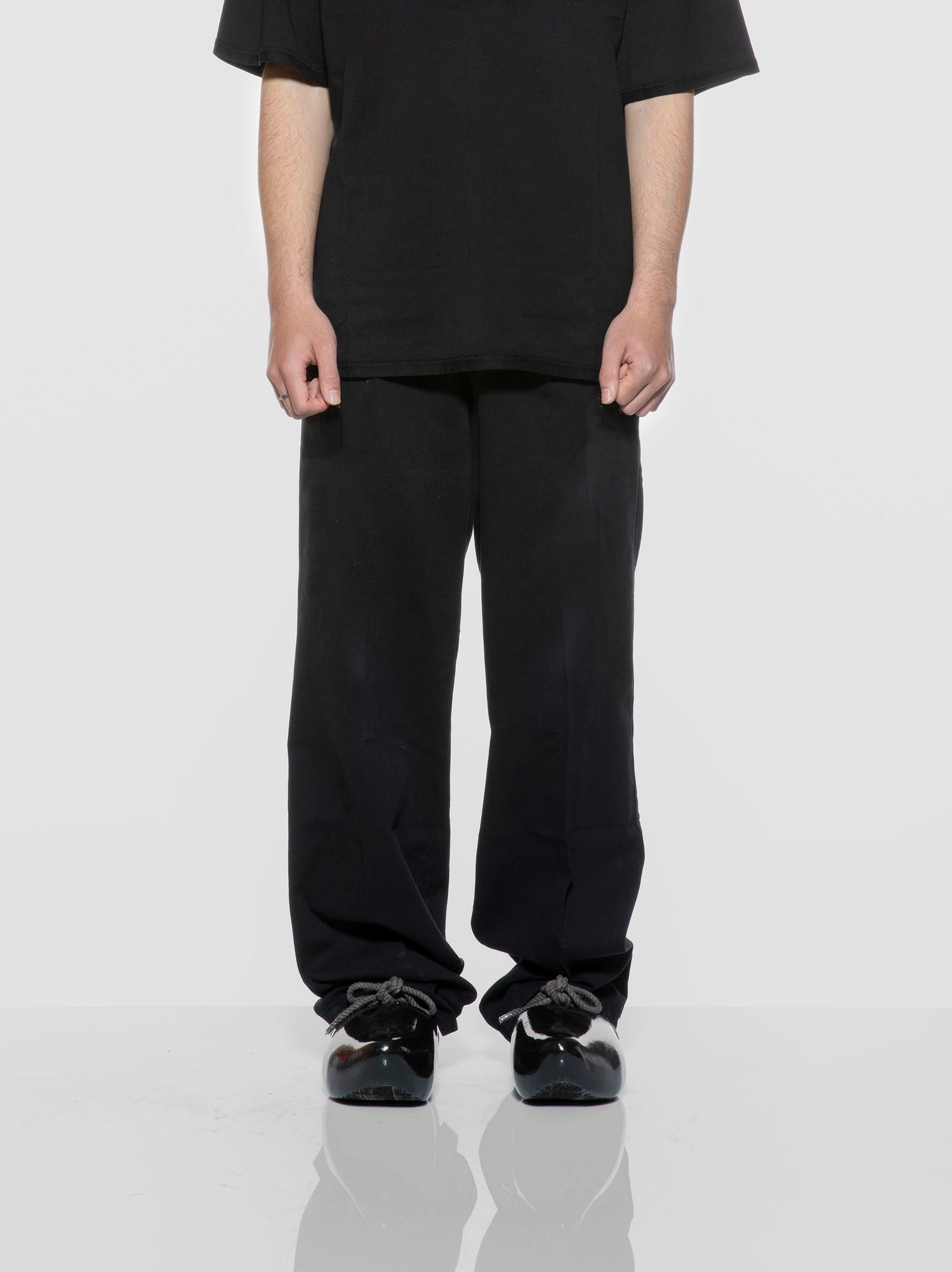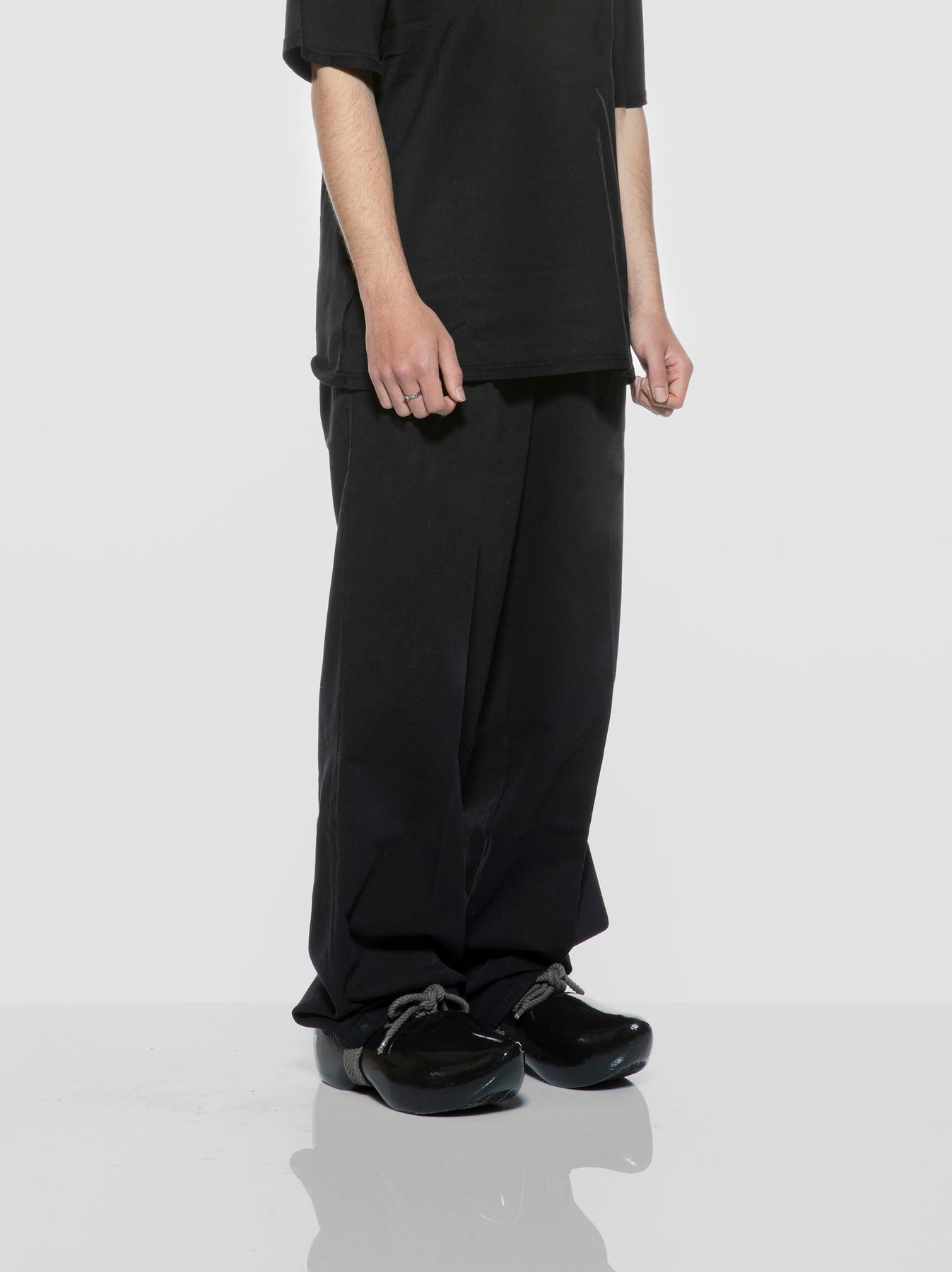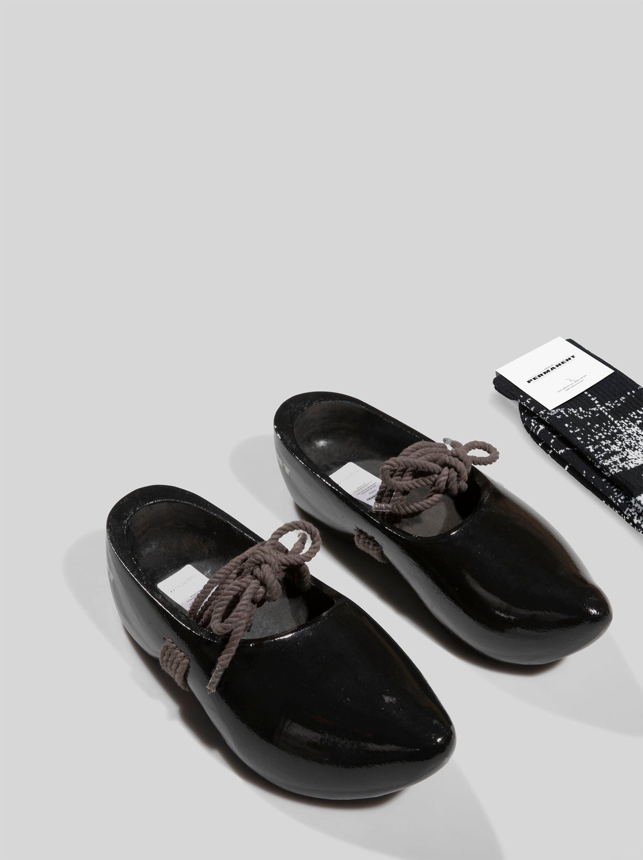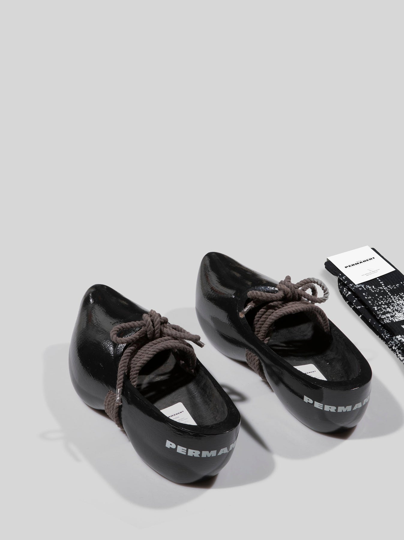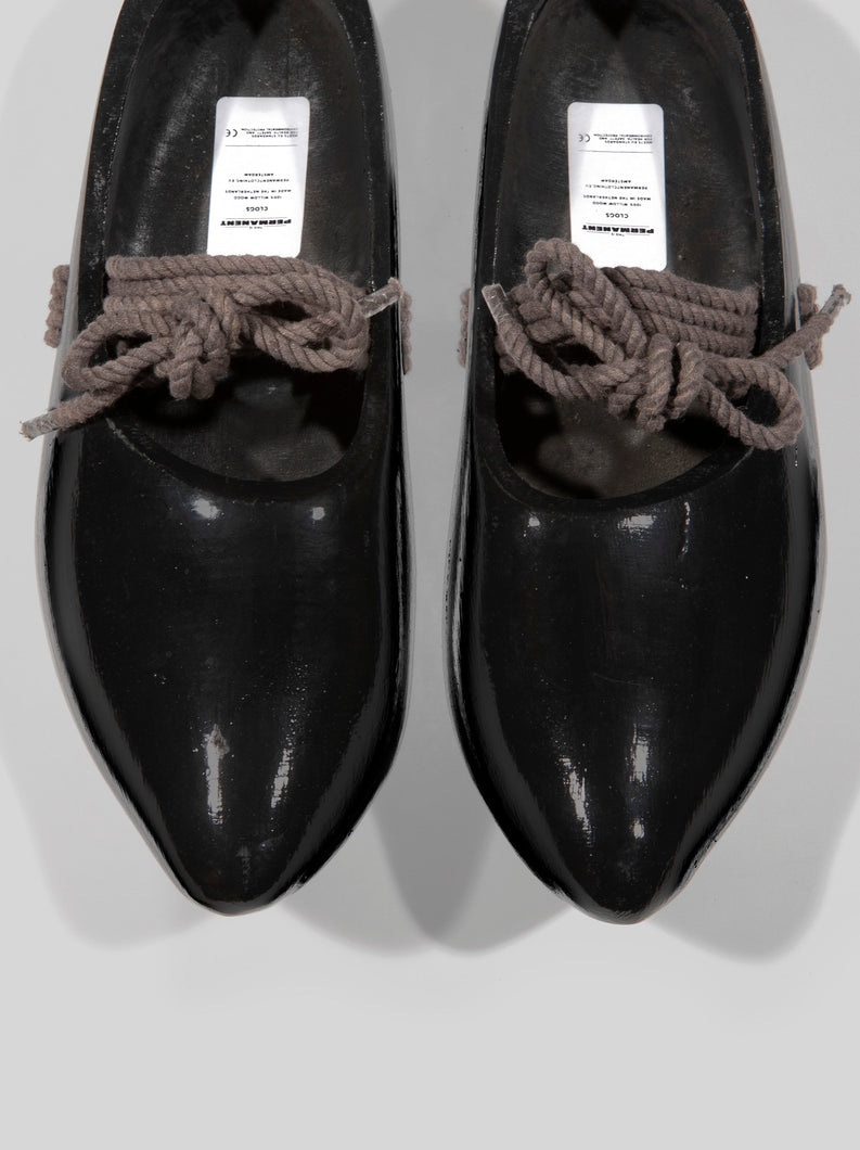 Single colour ‘Permanent’ design painted with water-based ink onto a pair of black clogs made from willow trees.