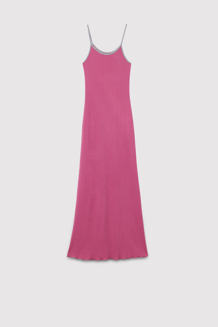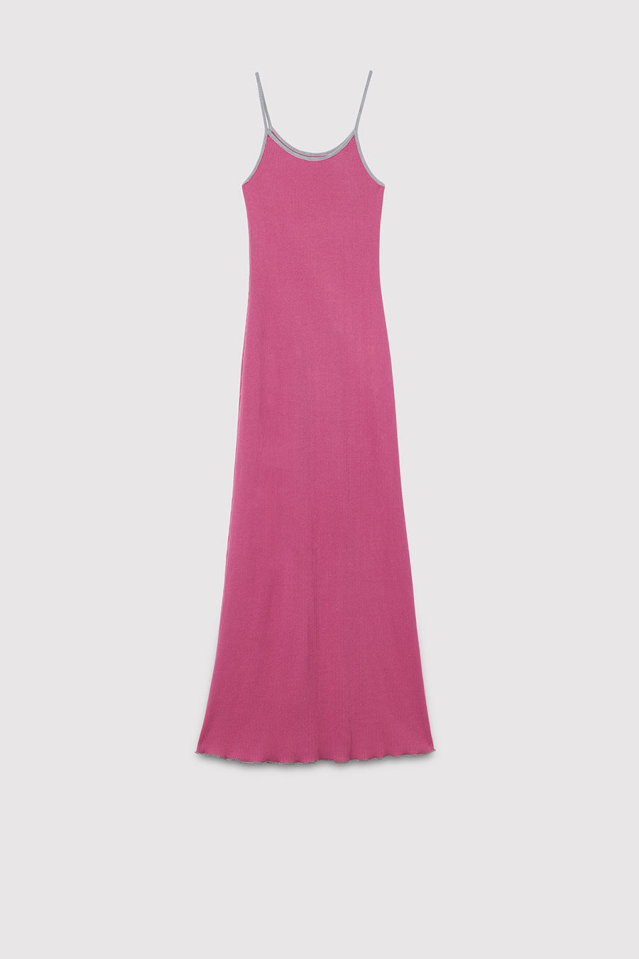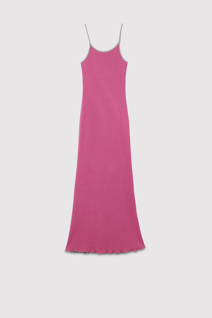 Plum pink upcycled cannetté cotton slip dress with contrasting grey edges. The slightly rounded neckline in front and deeper behind; contrasting grey frilled hem. Very snug fit but at the same time comfortable, thanks to the softness of the cannetté cotton.