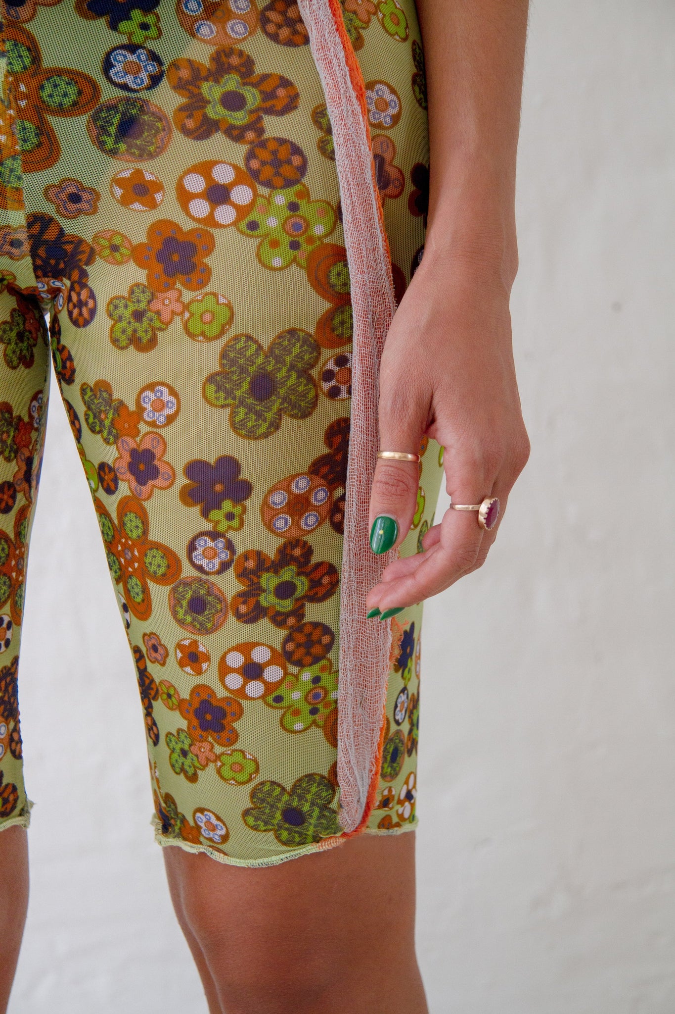 Slim fitting, semi-transparent mesh leggings shorts decorative seam in the bottom and vertical GAUZE inserts in the front.