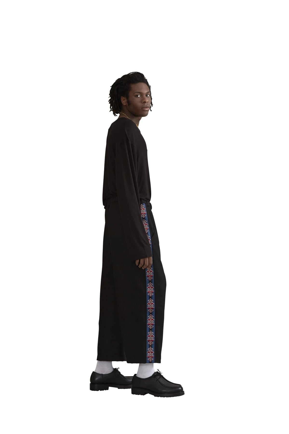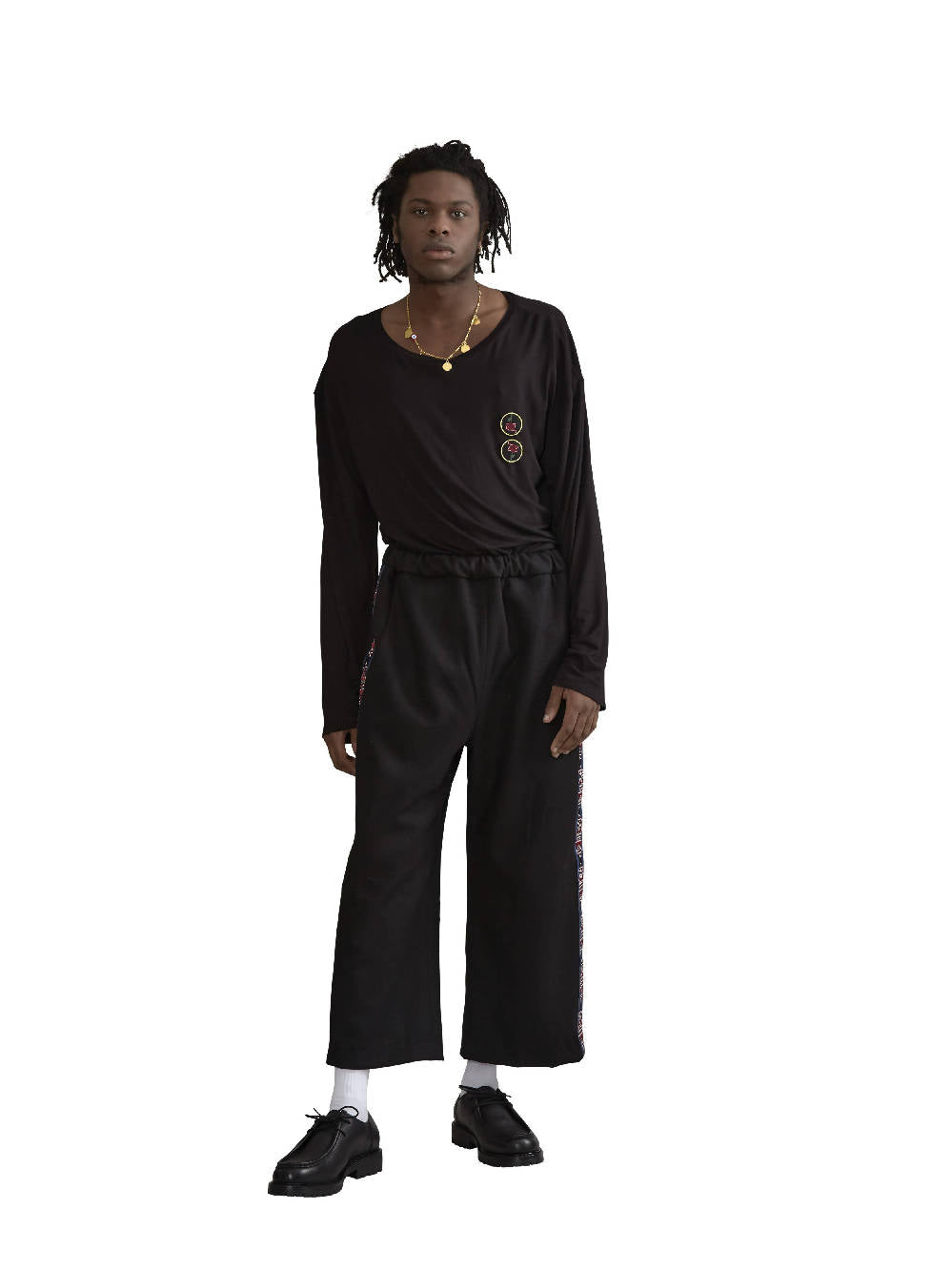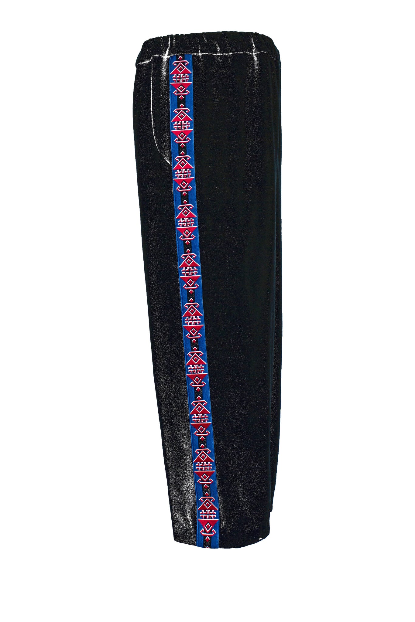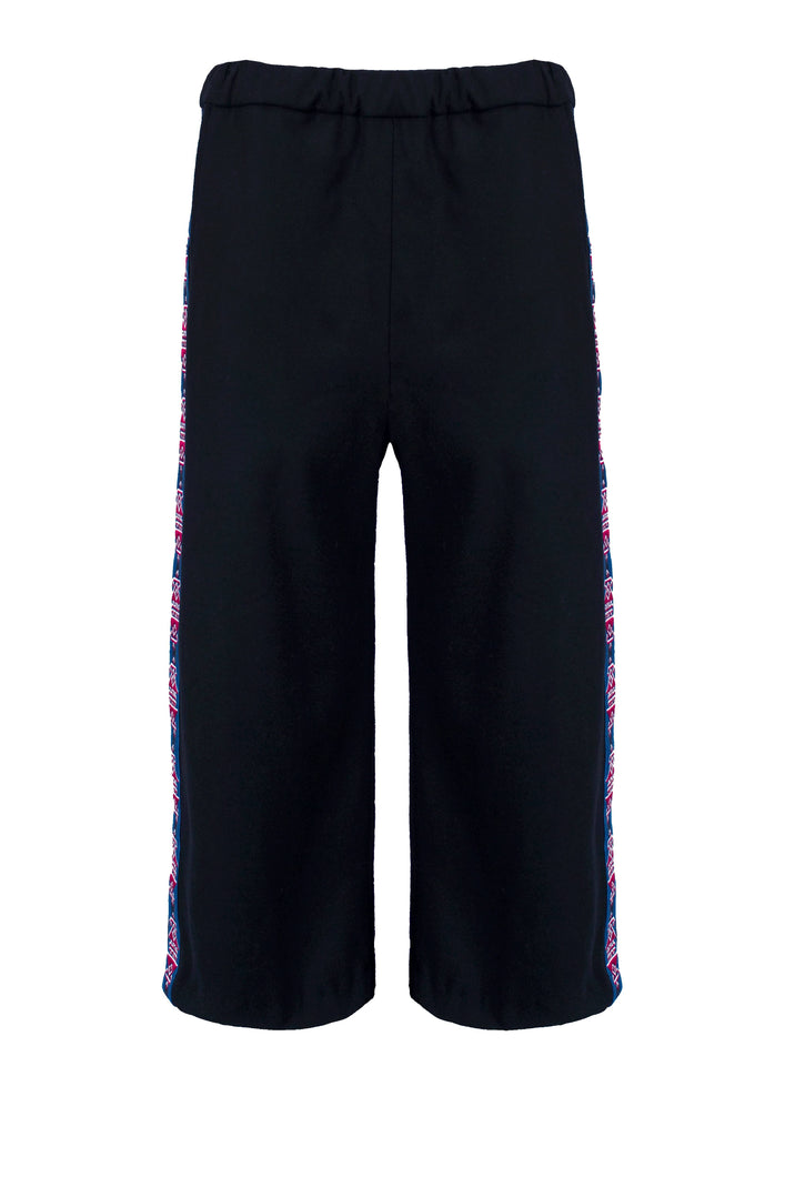 Elasticated waist. Satin lined pockets and embroidery details on the sides.