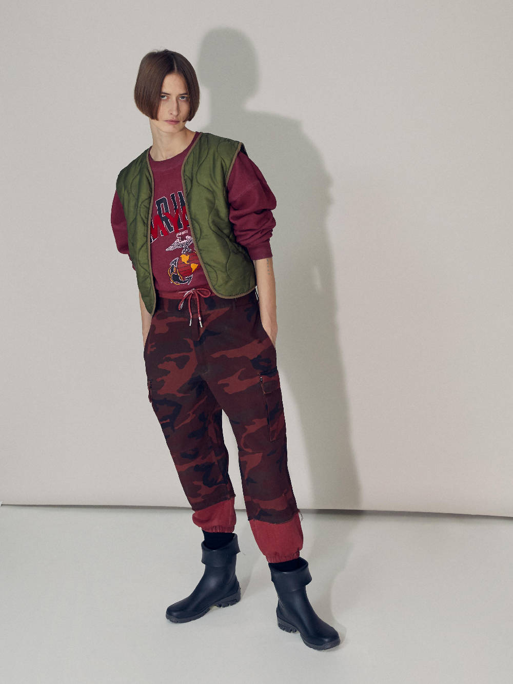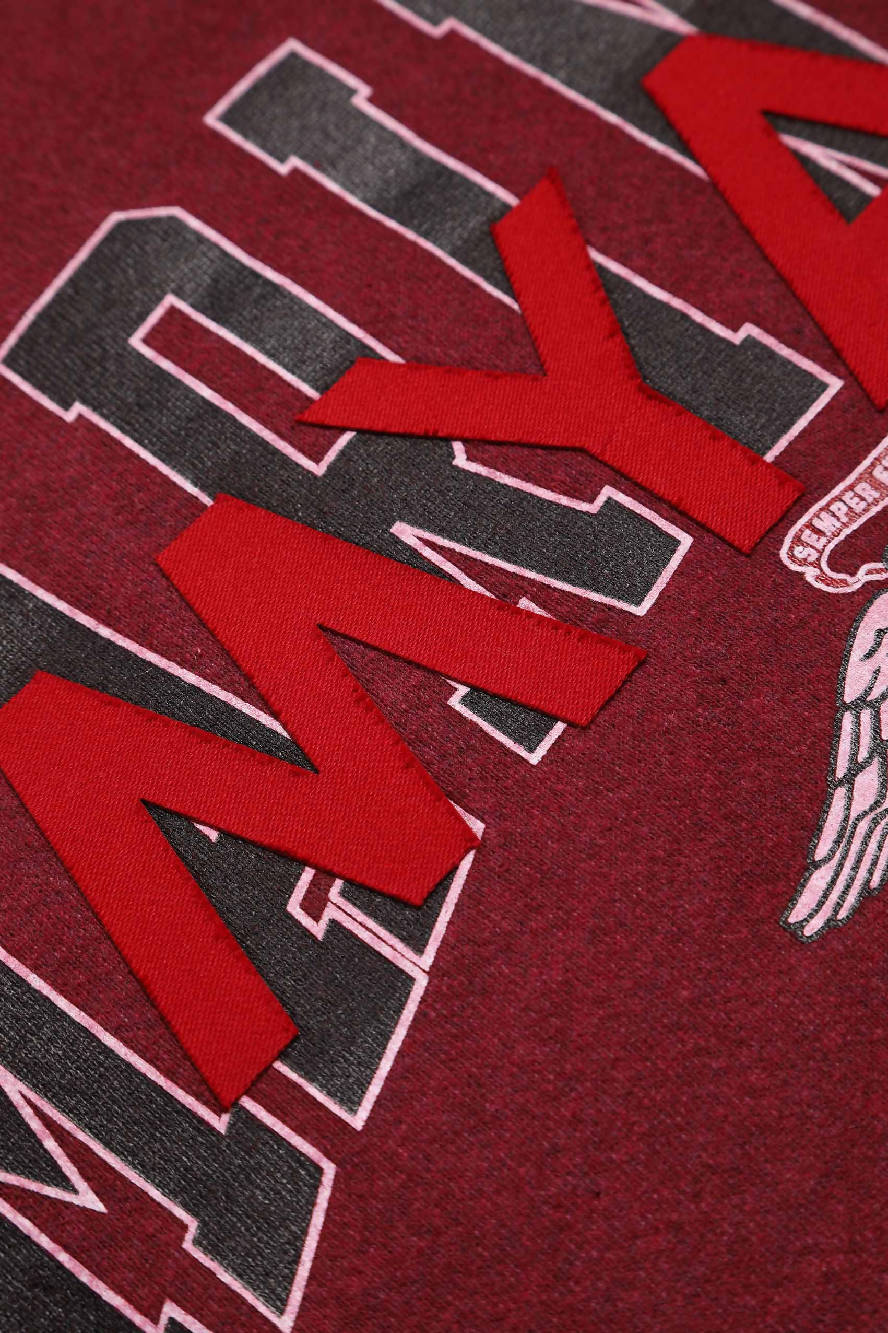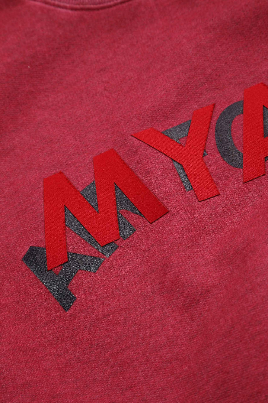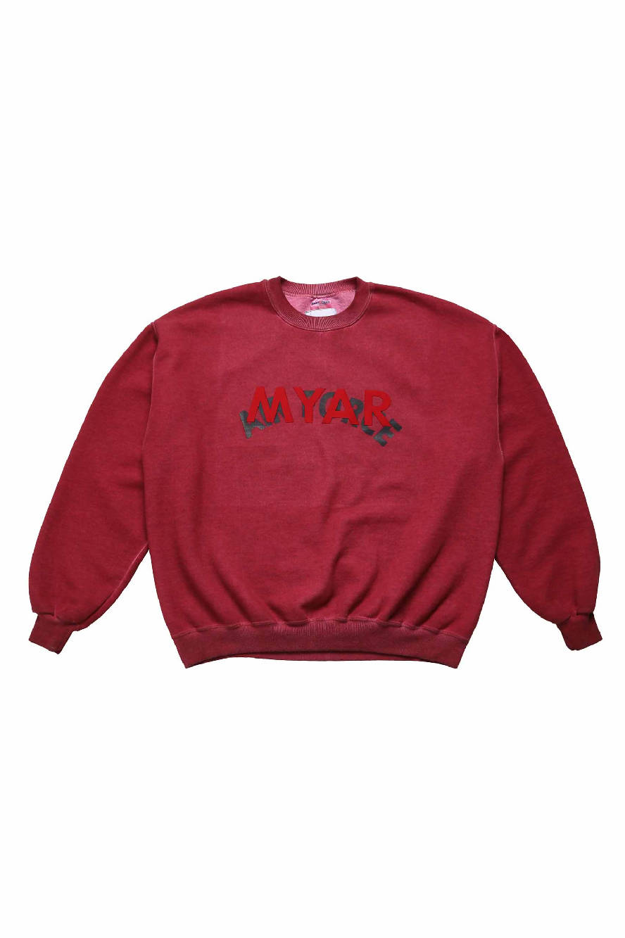 This is an original US ARMY sweatshirt that we hand-picked through many similar others. We garment cold dye the sweatshirt in yellow and red, and after we apply on top the tonal fabric thermo-bonded with the MYAR logo.