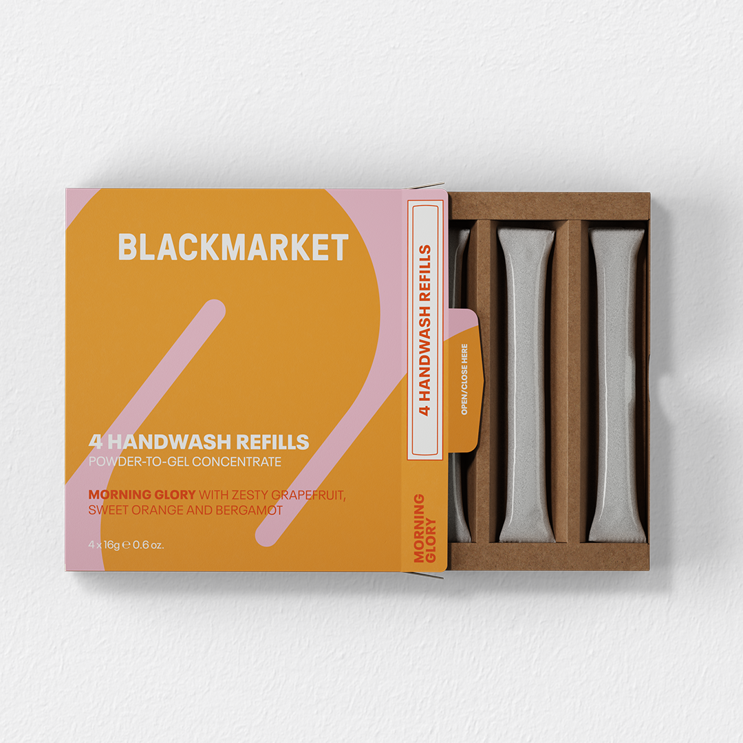Blackmarket refills are innovative in their delivery method. Traditional liquid handwash is made of 80% water. Our refills contain a waterless powder-to-gel concentrated soap, packaged in a safe material that dissolves in contact with warm water. The sachet becomes part of the product, acting as a thickener. Bringing you the convenience of the products you love, in an eco-friendly concentrated format.