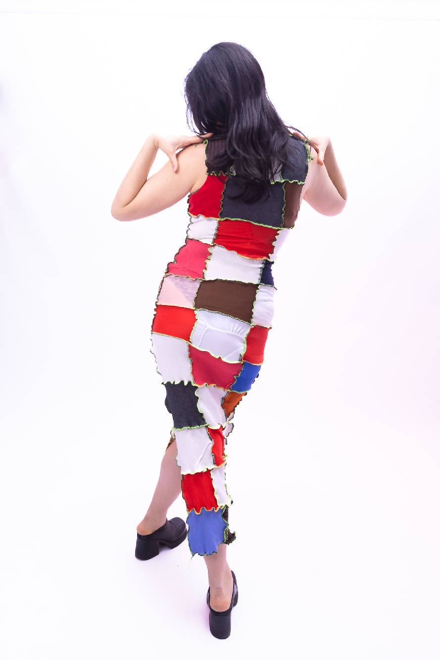 - Patchwork drawstring pants made from upcycled post-consumer knitwear.