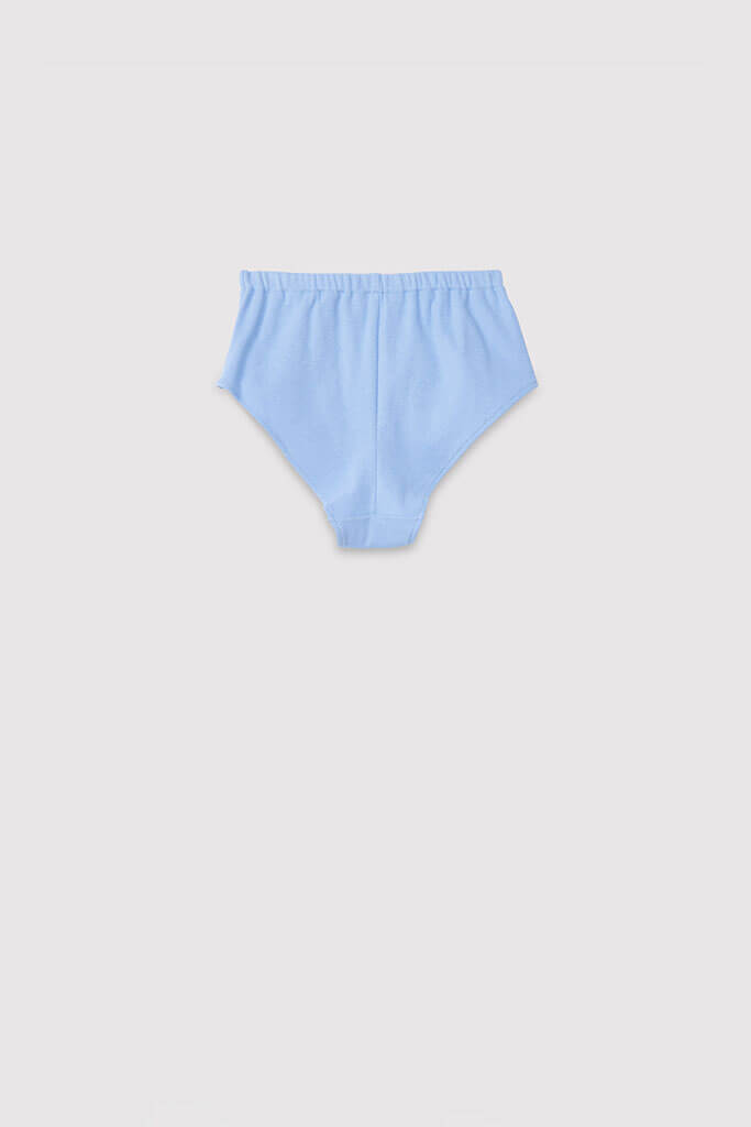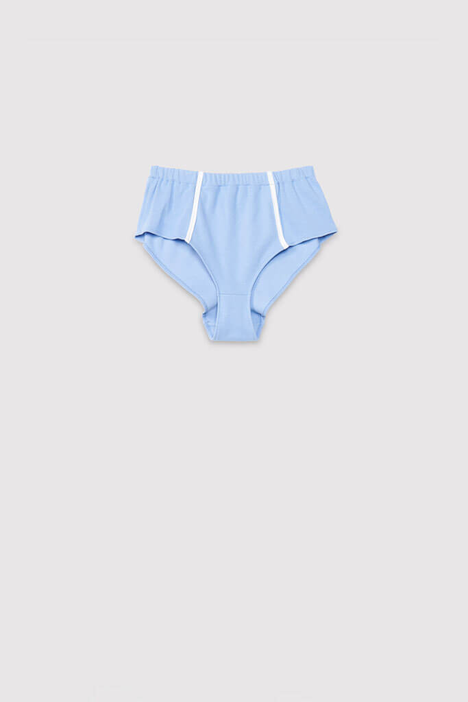 High-waisted culottes in upcycled light blue cotton with contrasting white edges in cannetté cotton. An elastic waist and central seam on the back highlight the female body shapes.