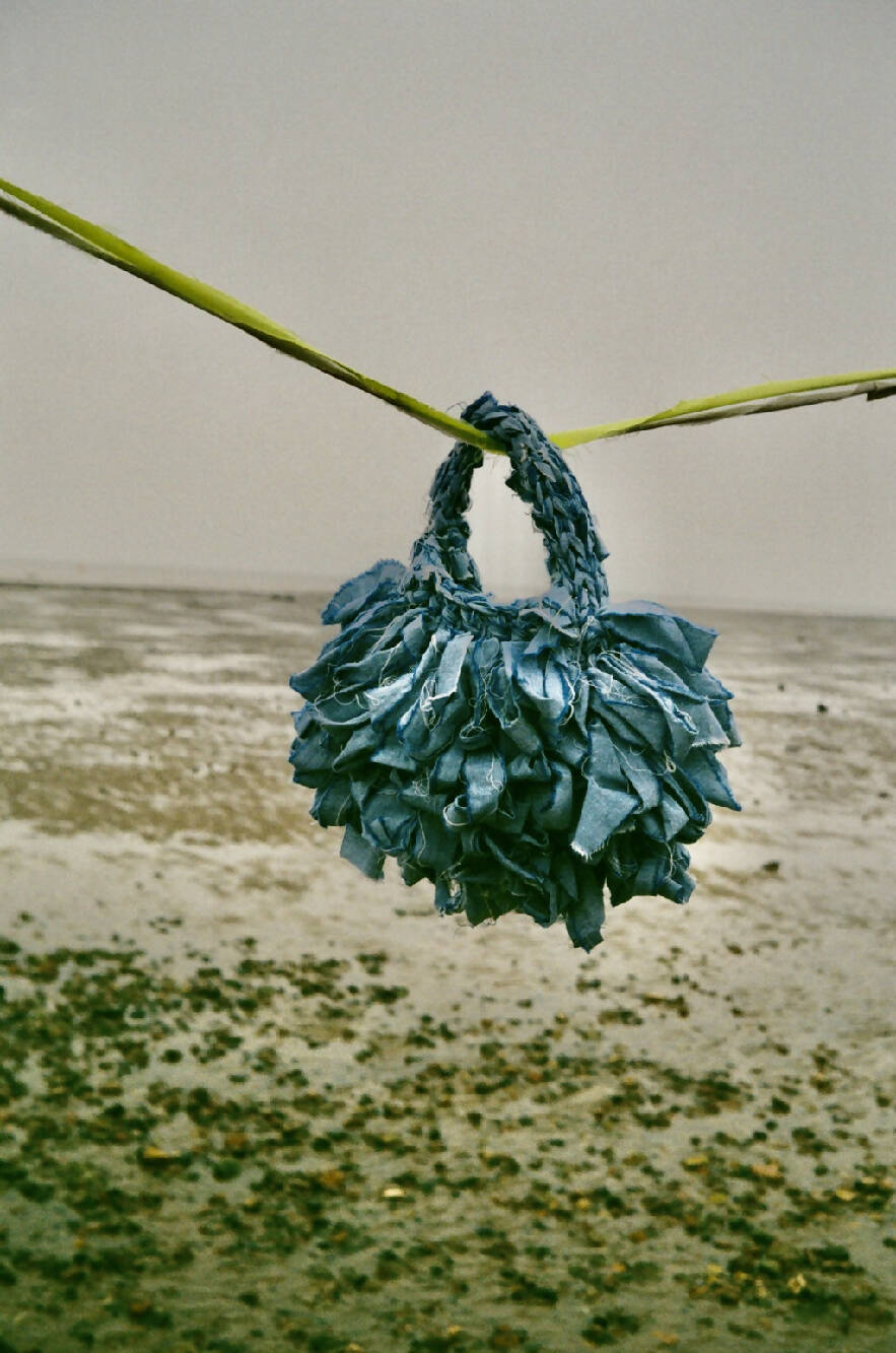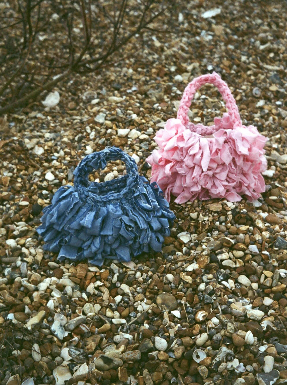 Knitted by hand from repurposed bedsheets.