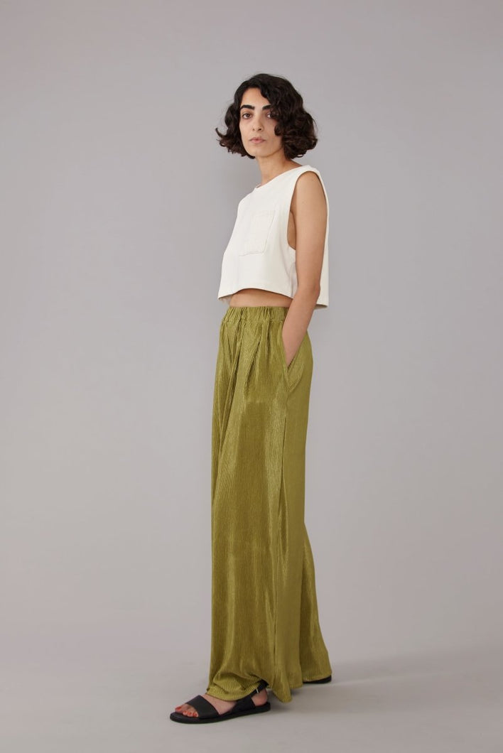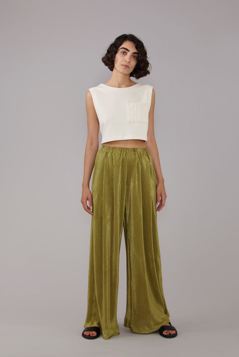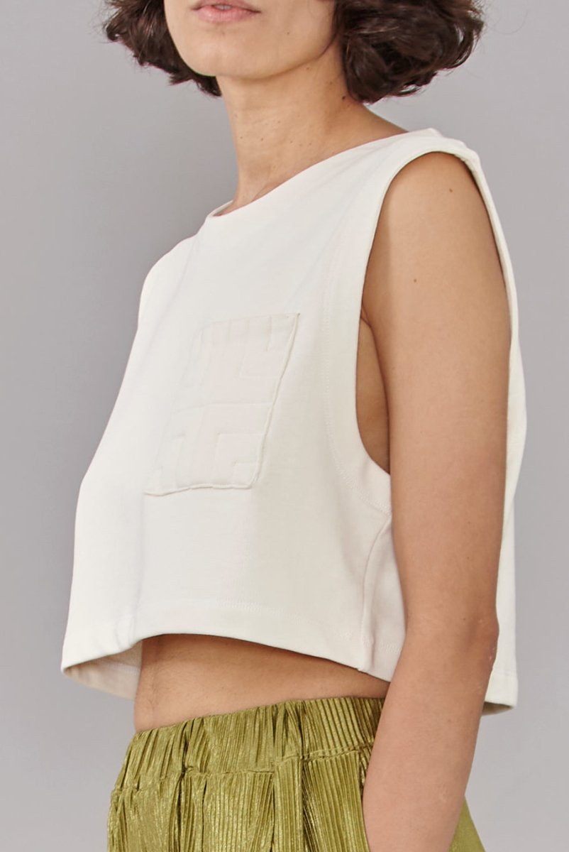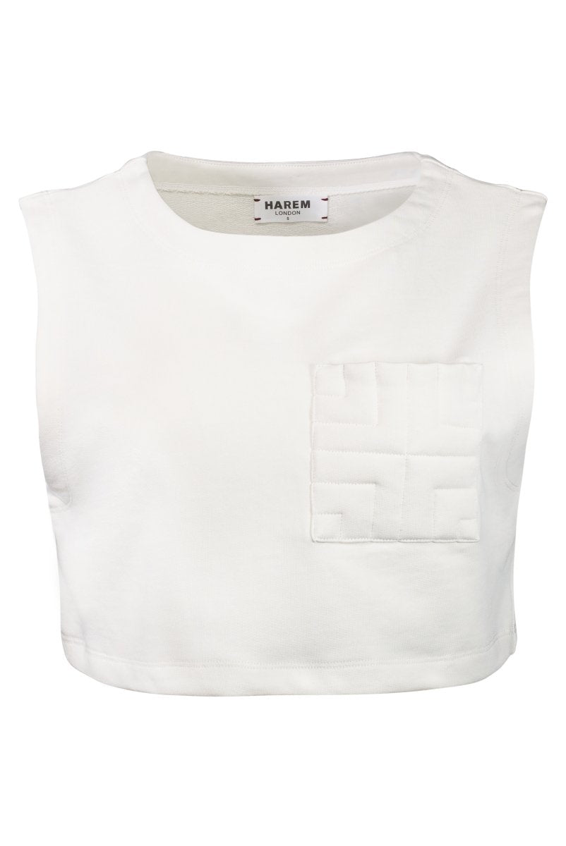 • Round neck, clean finished sleeveless arms and cropped straight hem. Quilted pocket detail on left chase.