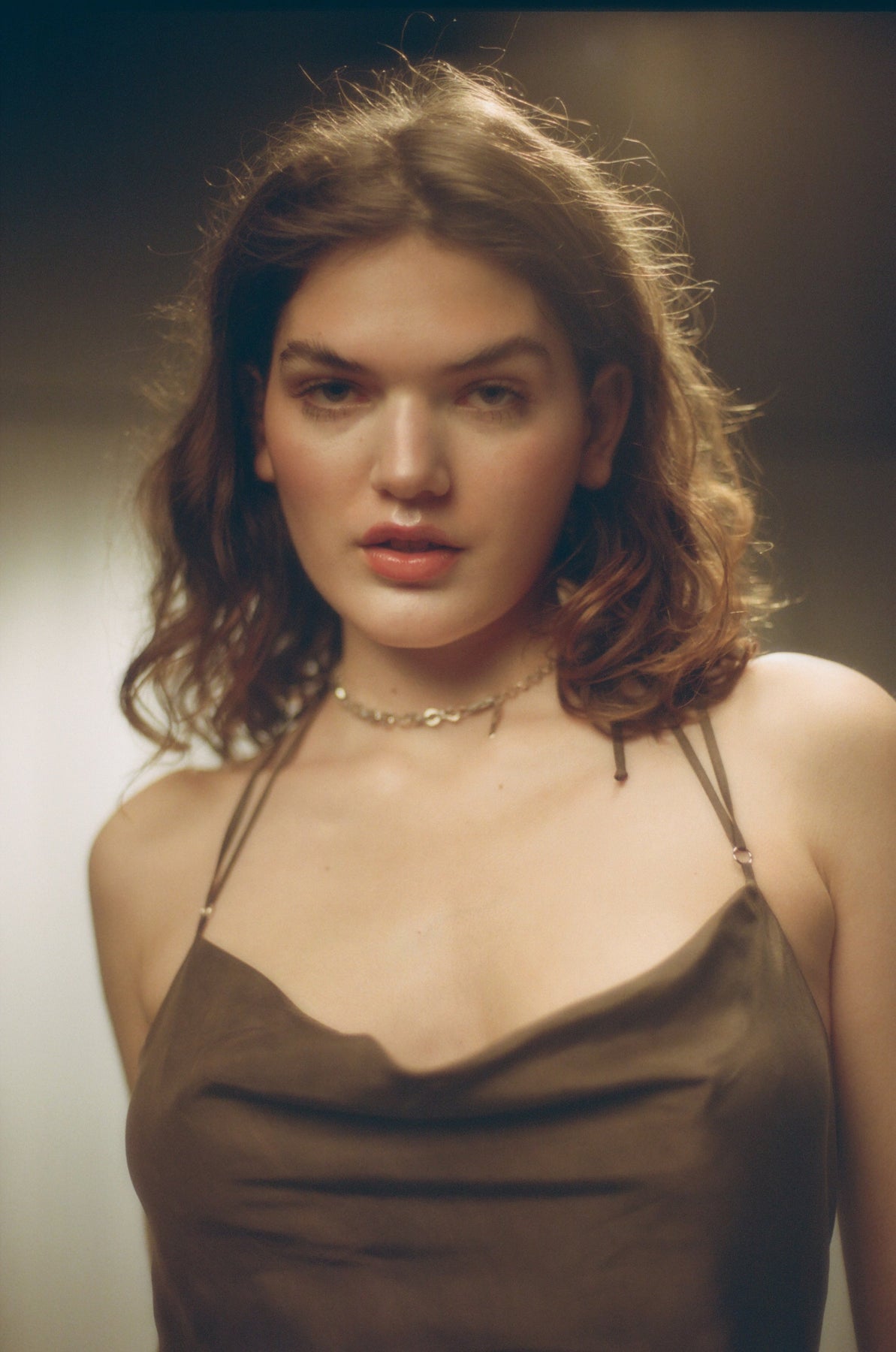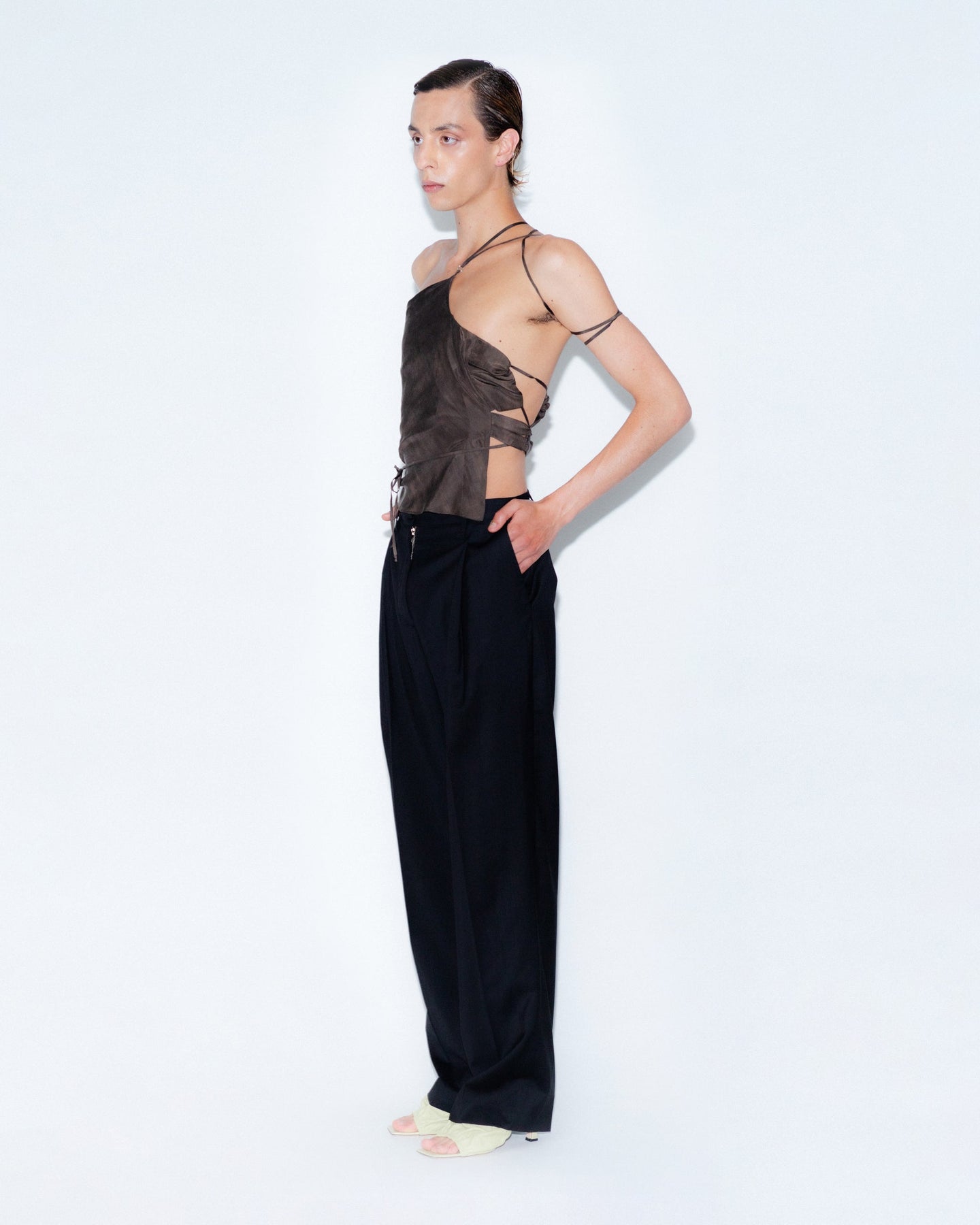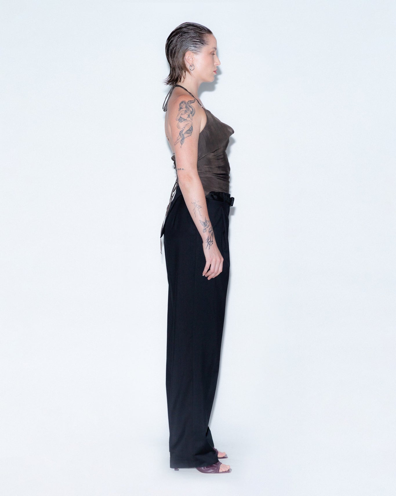 Versatile silk top with a peach-skin like feel. The open back is inspired by the art of Shibari. Perfect to pair with leather trousers for an elegant night out.