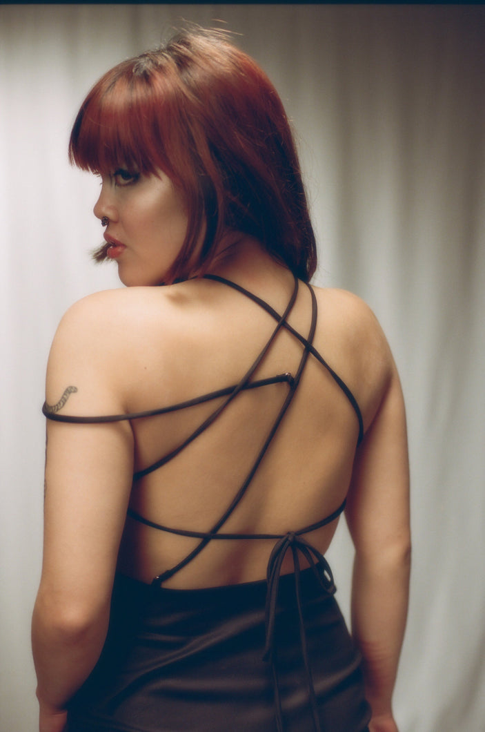 The little black dress, re-imagined. This is what you wear when you want elegant and classy but with an edge. It comes with an open back with overlapping straps that add that extra twist you need. The dress has side adjustments allowing you to modify the length as you want — whether it's a midi or mini dress.