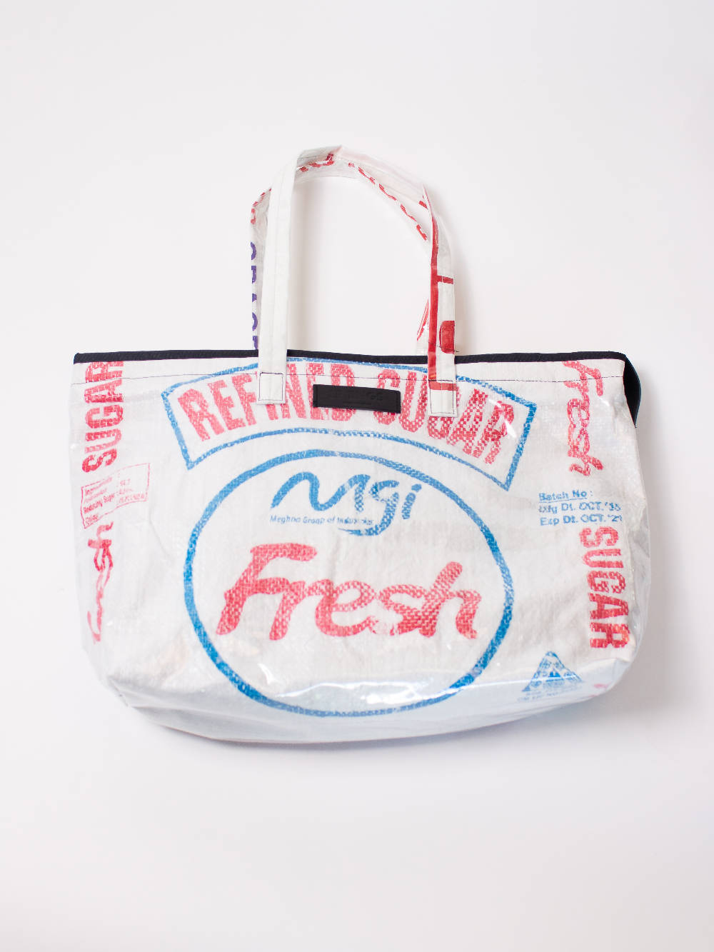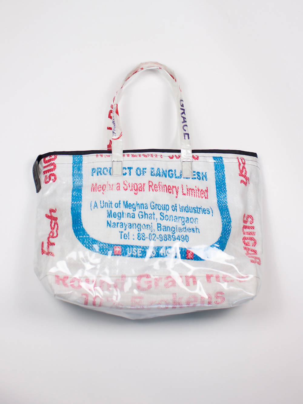 Le Tings creates from repurposed rice bags which are carefully cut and collaged to create new designs, previously carrying 50kgs of rice, now with an outer coating of protective non toxic pvc. Each bag is one of a kind with no two bags ever being identical. Thanks to its long handles, the style can be carried as a shoulder bag and the open top allows for easy access to grab whatever you need, whenever you need it.
