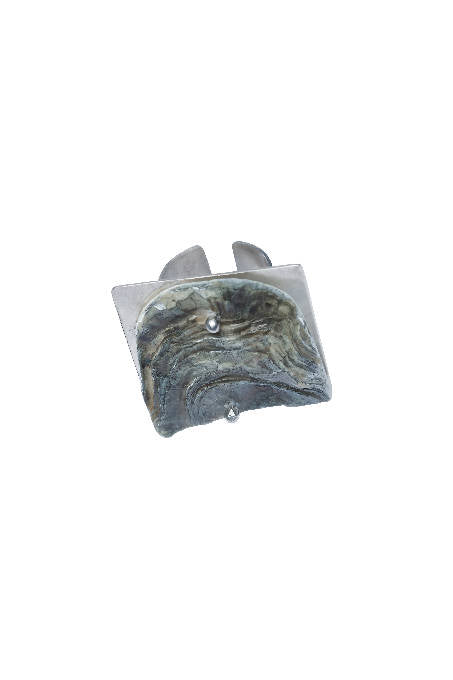 Mia Larsson is a Swedish based designer that focuses on sustainability and seashells. This statement ring showcases the outside of an oyster shell on recycled metal.