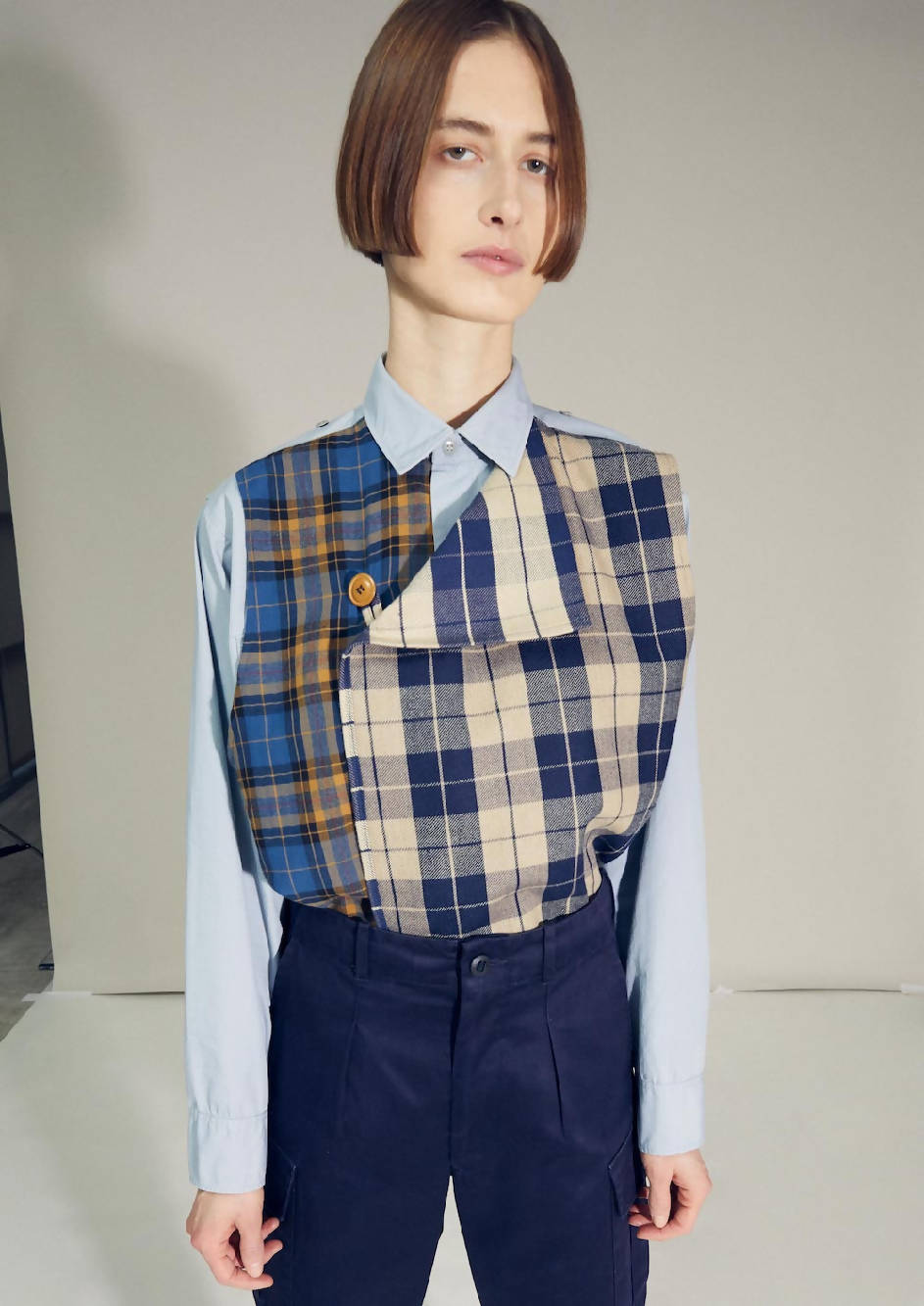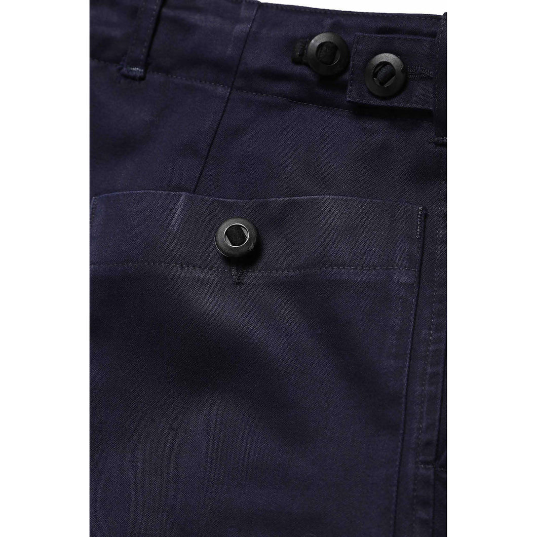 This British trouser has been customized giving a completely different silhouette. We shortened the pants by giving a 7/8 length, we adjust the crotch curve making it more "slim" taking out the extra fabric from its original. We unstitched the velcro on the side pocket giving more softness and less rough surface, we rebalance the internal leg line taking out a few cm of fabric and giving a smooth carrot shape to the overall pant.