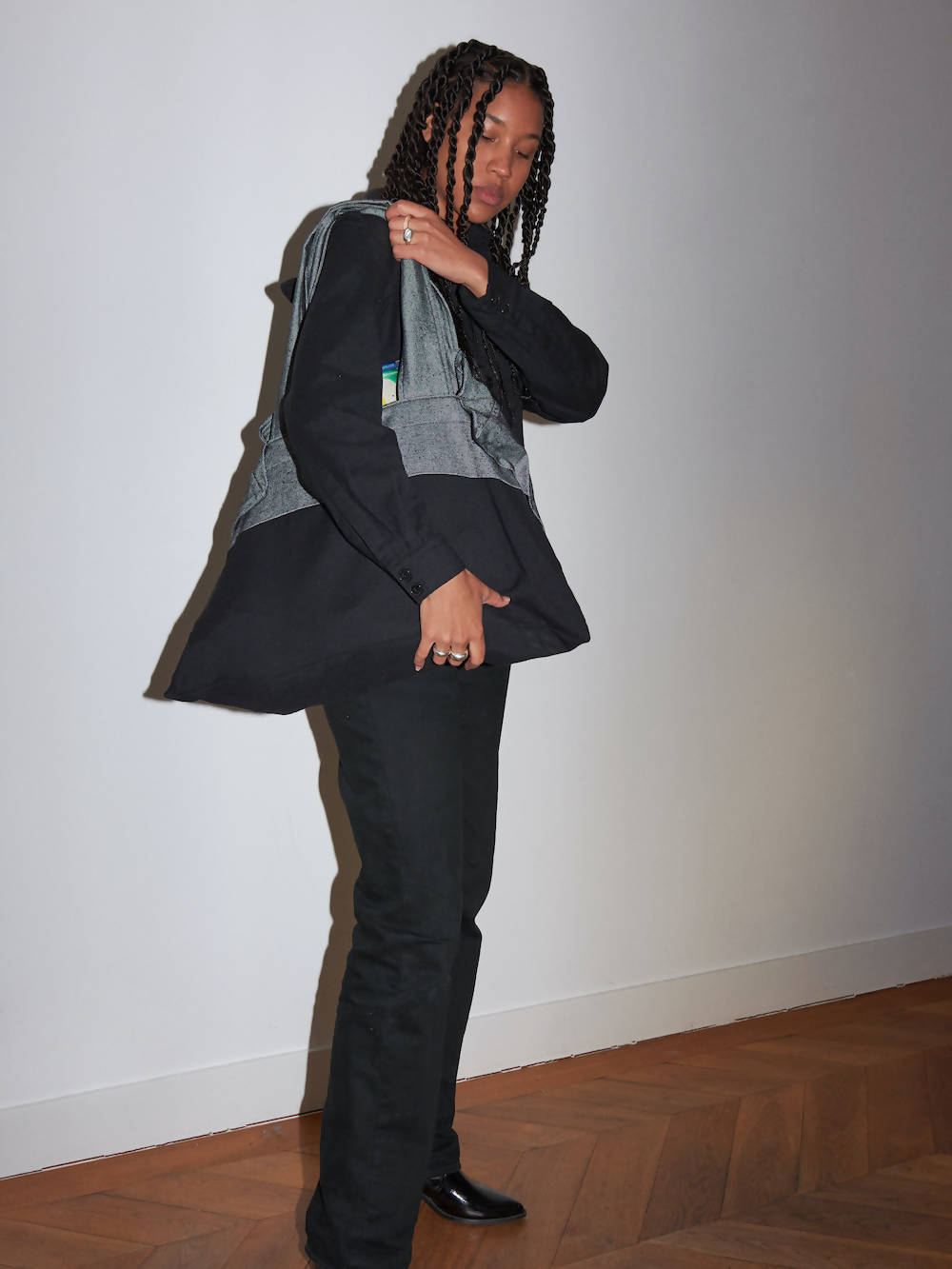Once collected, designer Bart Hess and recycle partner Wolkat transformed the used clothes into new useful materials - recycled yarns and 6 kilometers of textile. With these materials, New Order of Fashion talent Marie Sloth Rousing created a brand new capsule collection launching first at PARO STORE with this nifty bag.