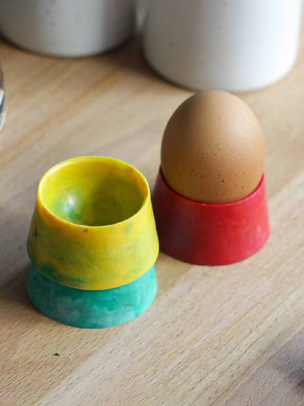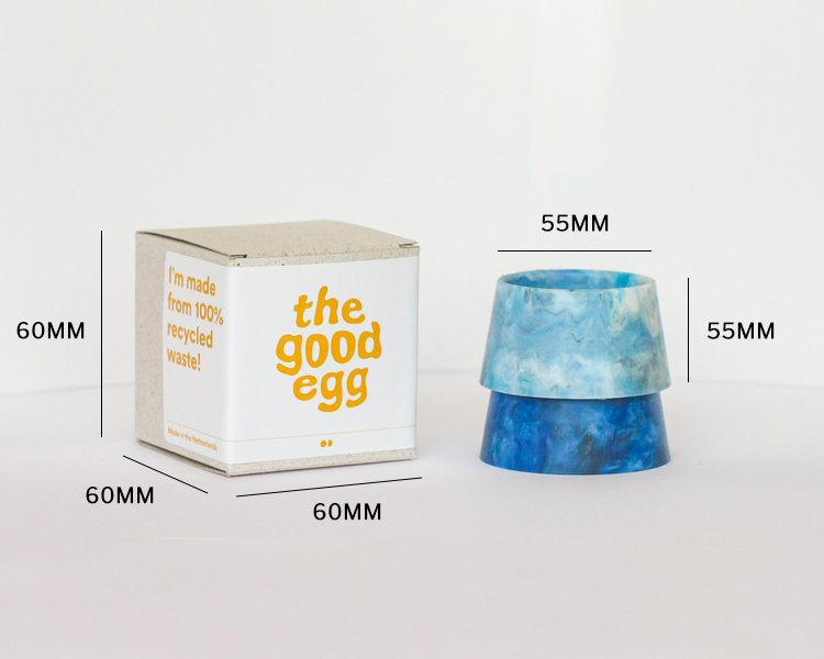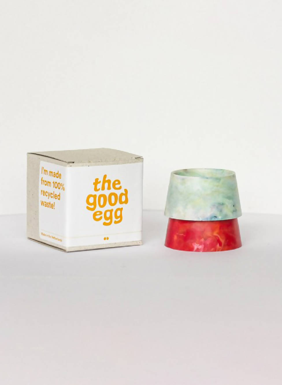 The Good Egg is a pair of stackable egg cups, showing that our collective effort to recycle and reuse plastic waste has a real effect.