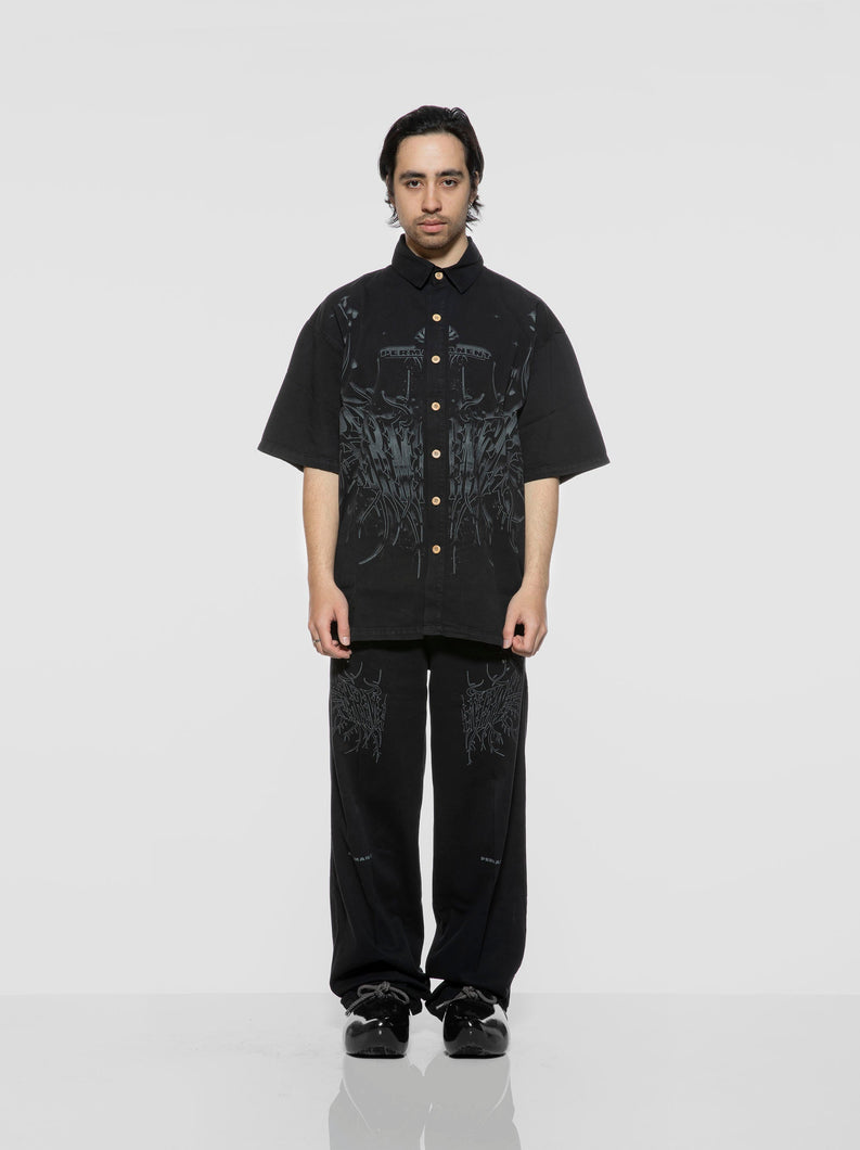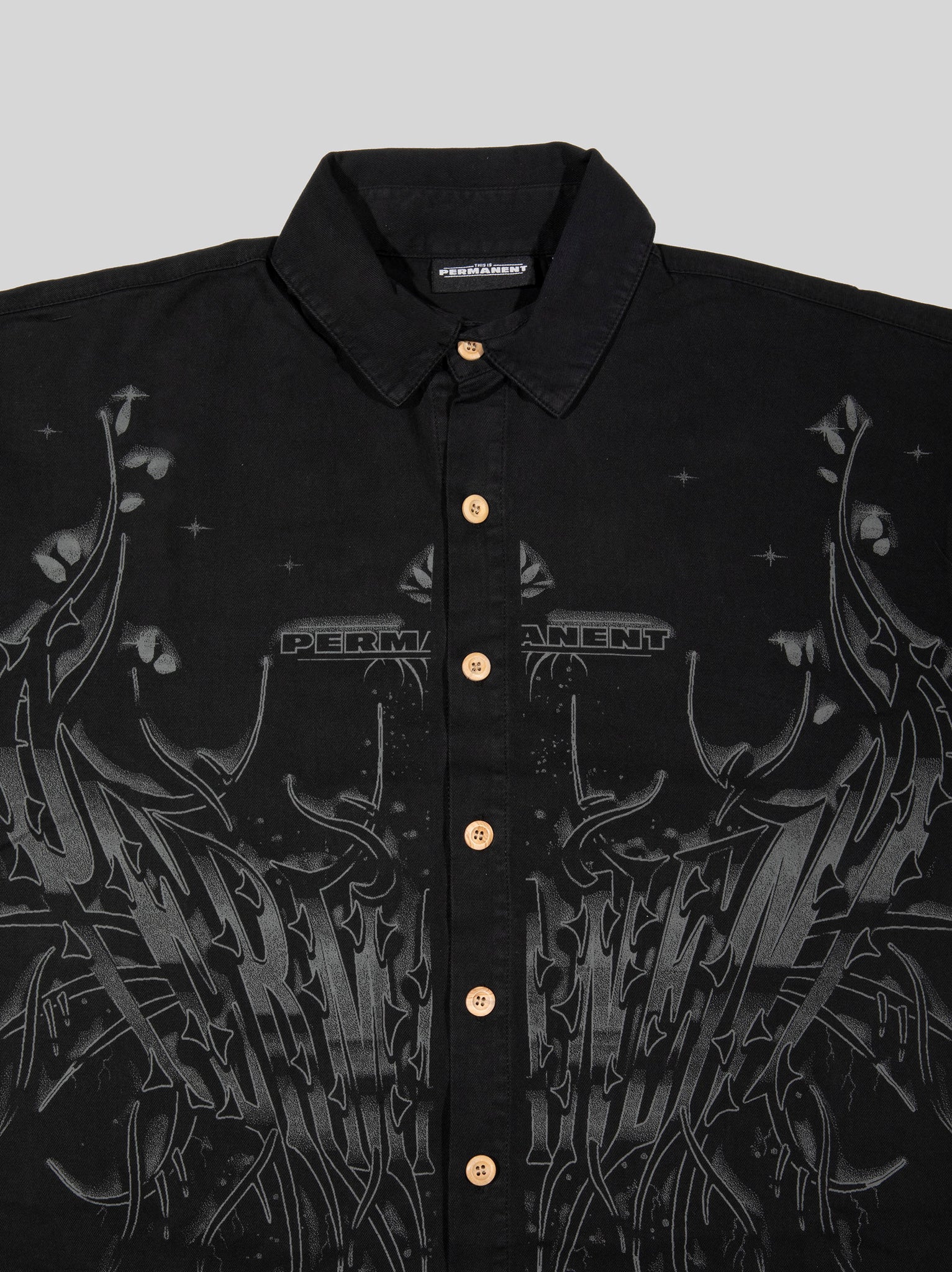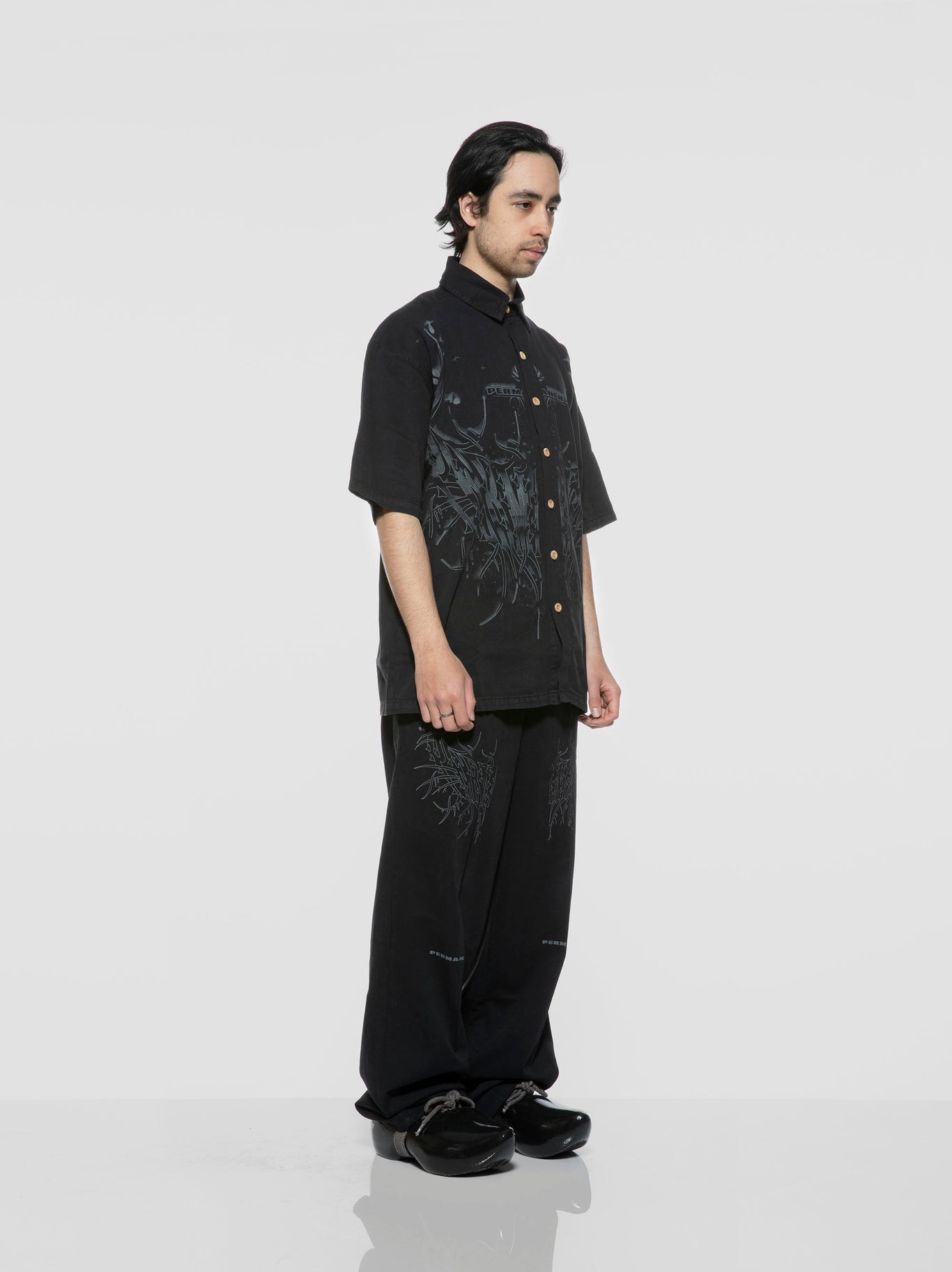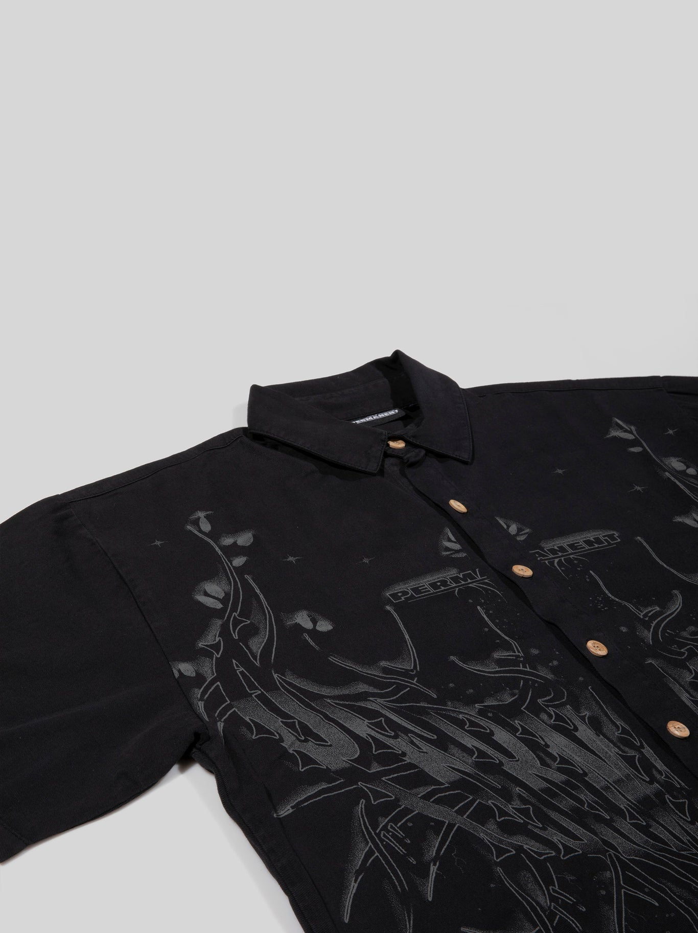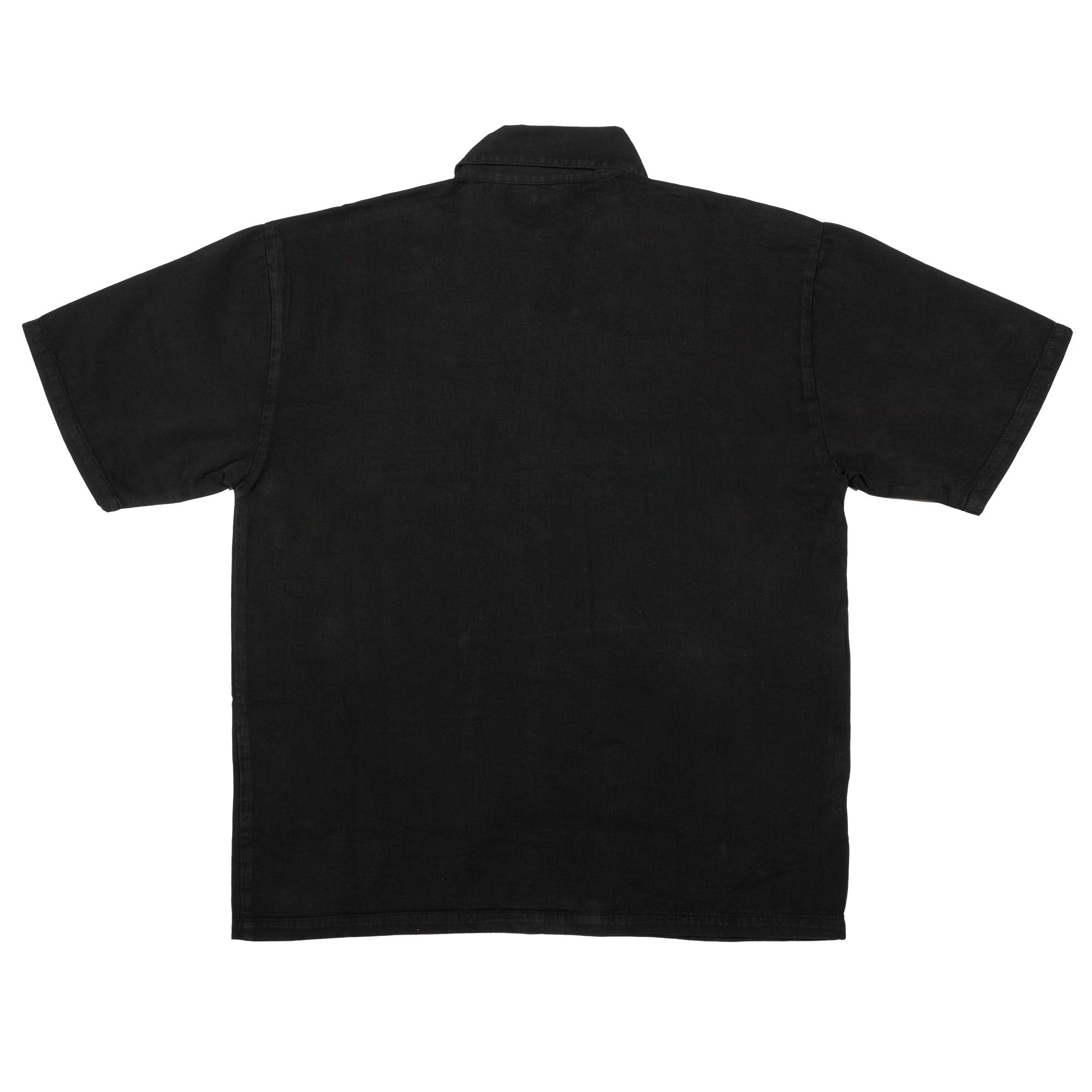 Single colour ‘Dirt’ design screenprinted with water-based ink onto an organic cotton black shirt. The shirt has wooden buttons and a rather oversized fit.