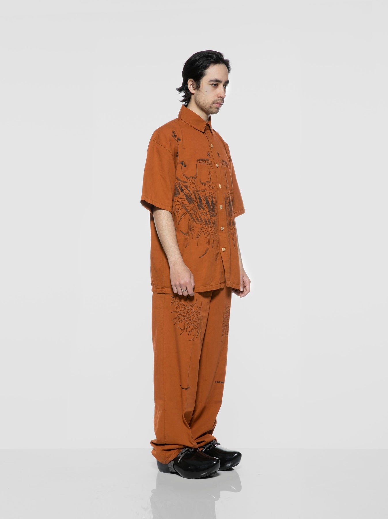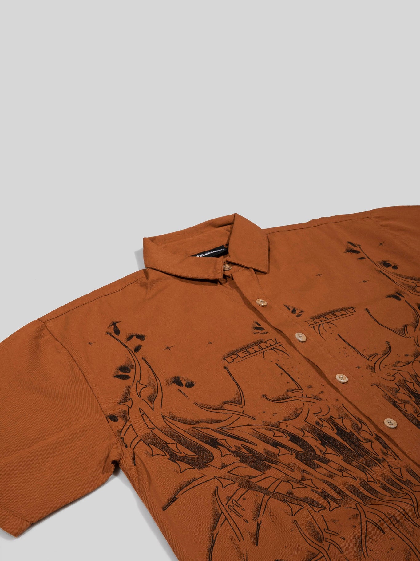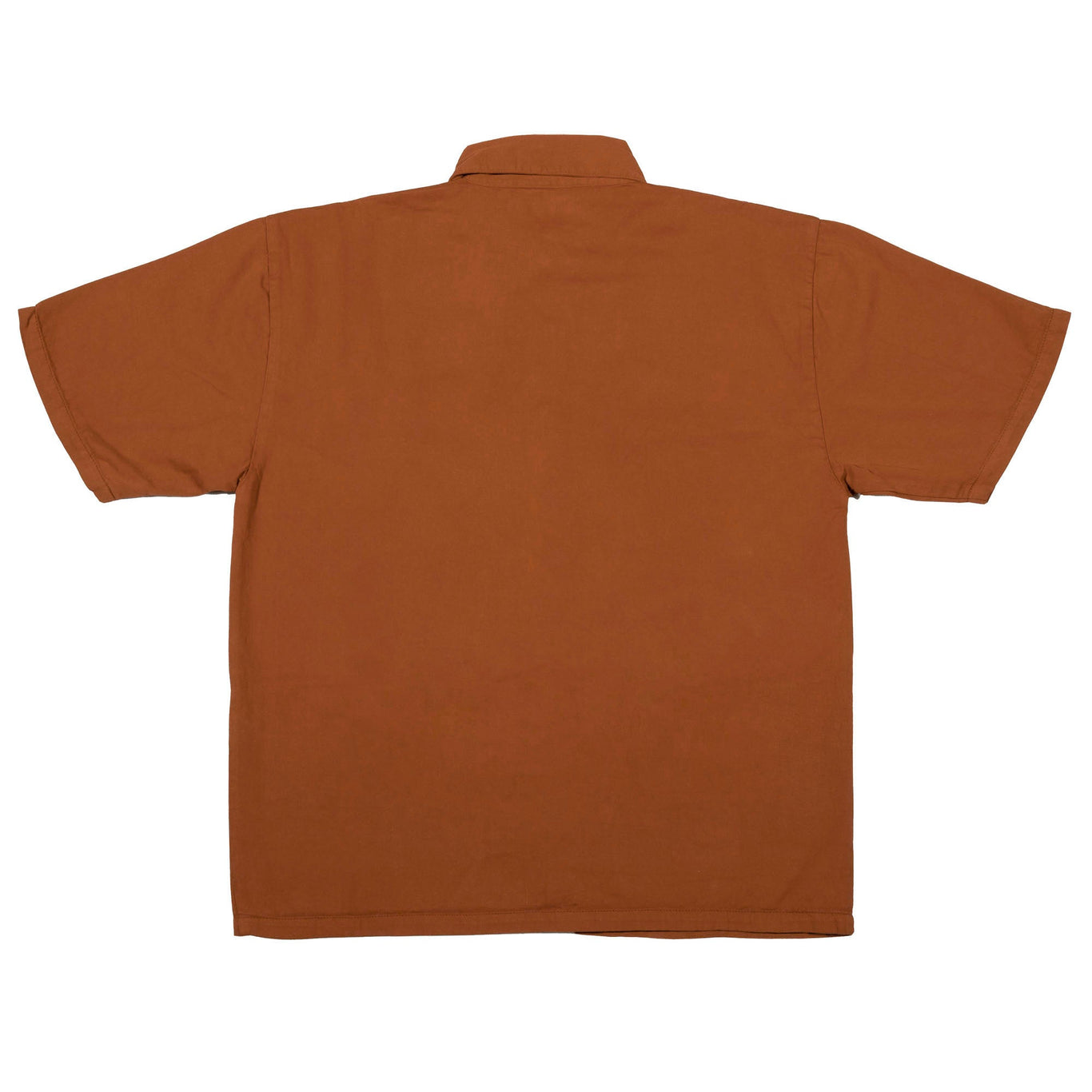 Single colour ‘Earth’ design screenprinted with water-based ink onto an organic cotton terracotta shirt. The shirt has wooden buttons and a rather oversized fit.