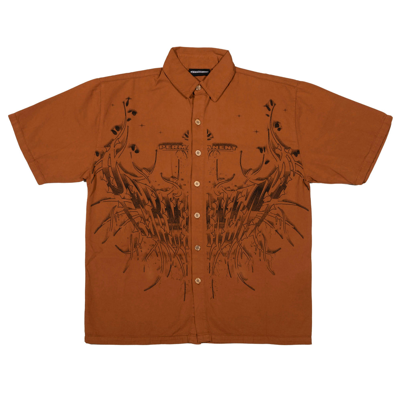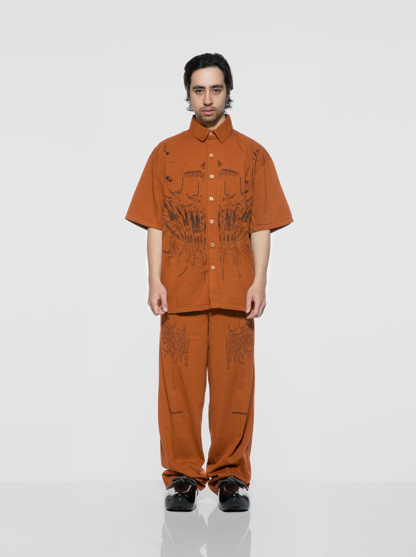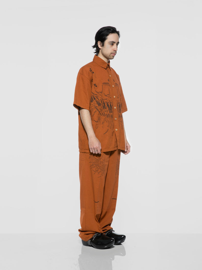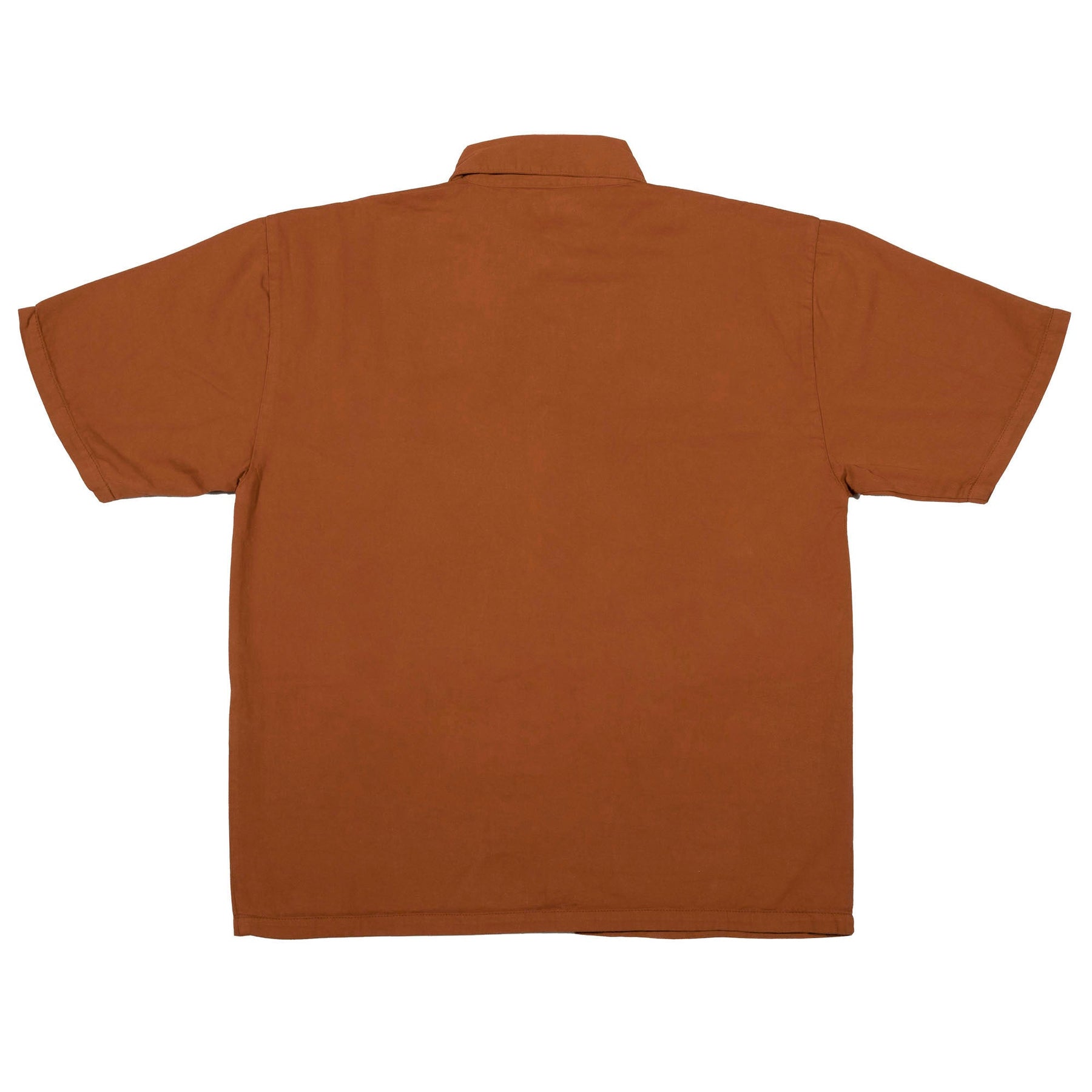 Single colour ‘Earth’ design screenprinted with water-based ink onto an organic cotton terracotta shirt. The shirt has wooden buttons and a rather oversized fit.