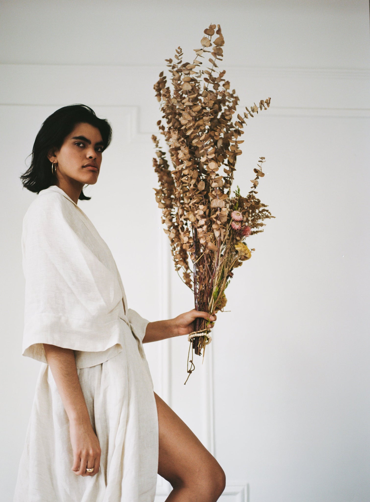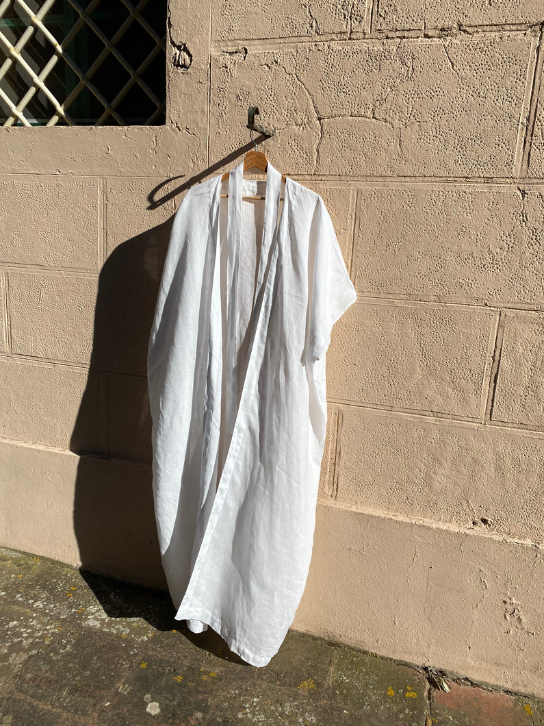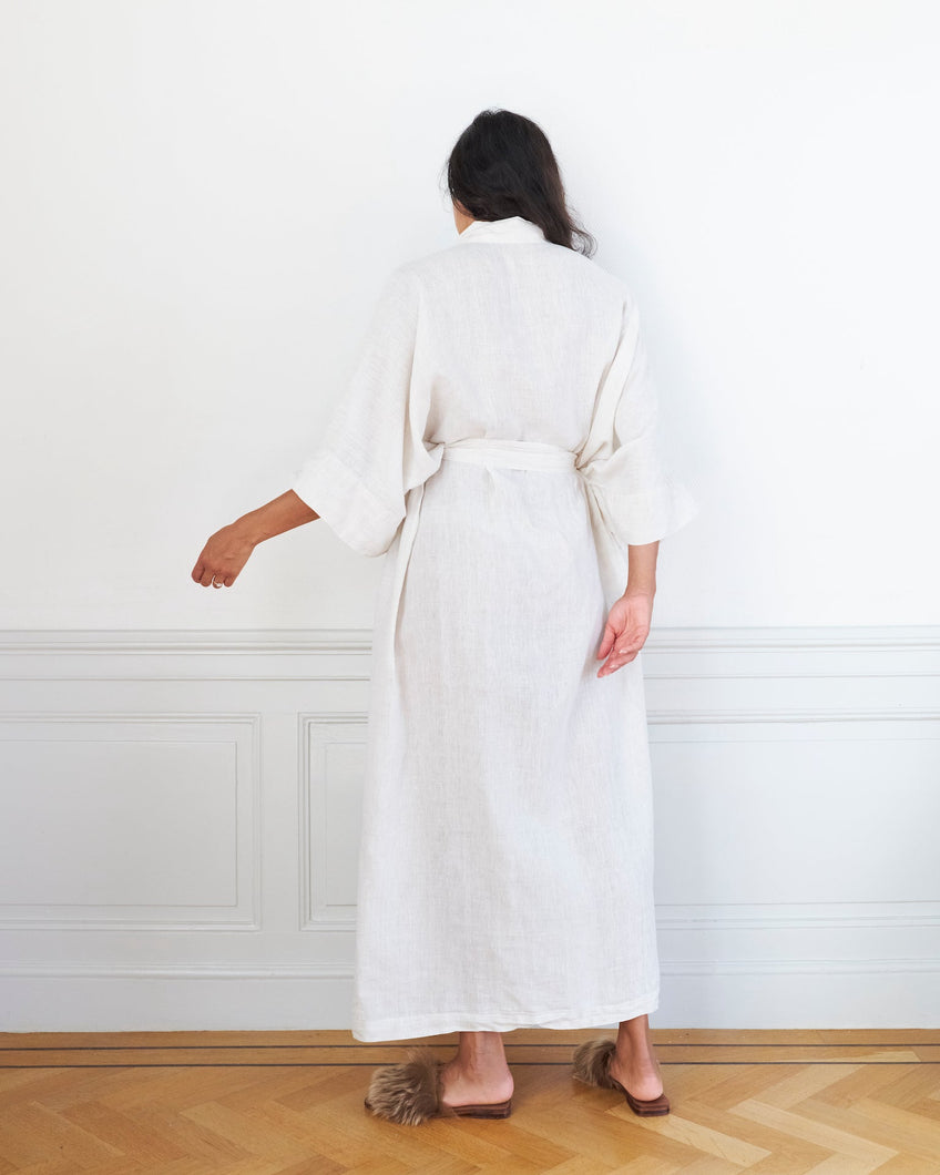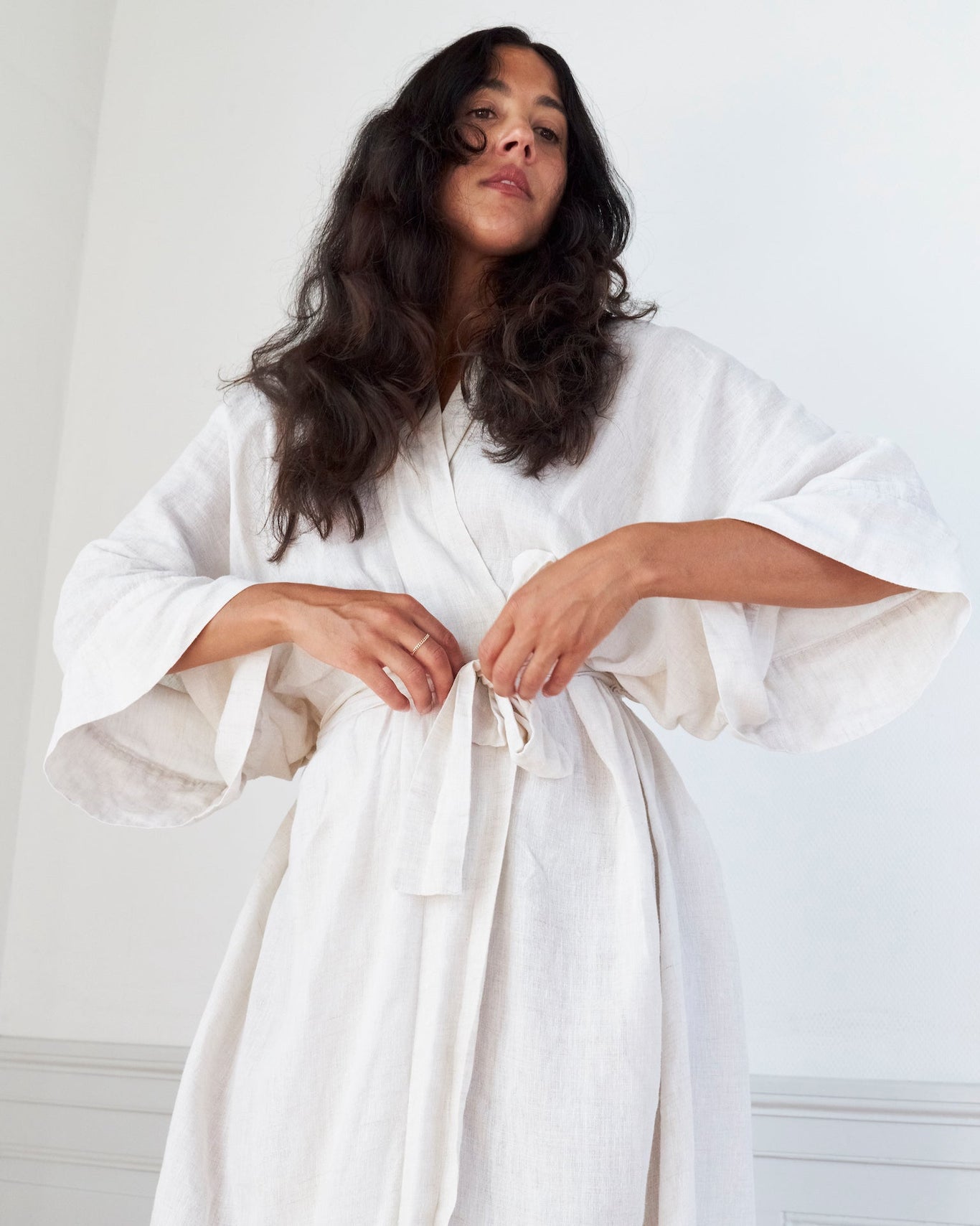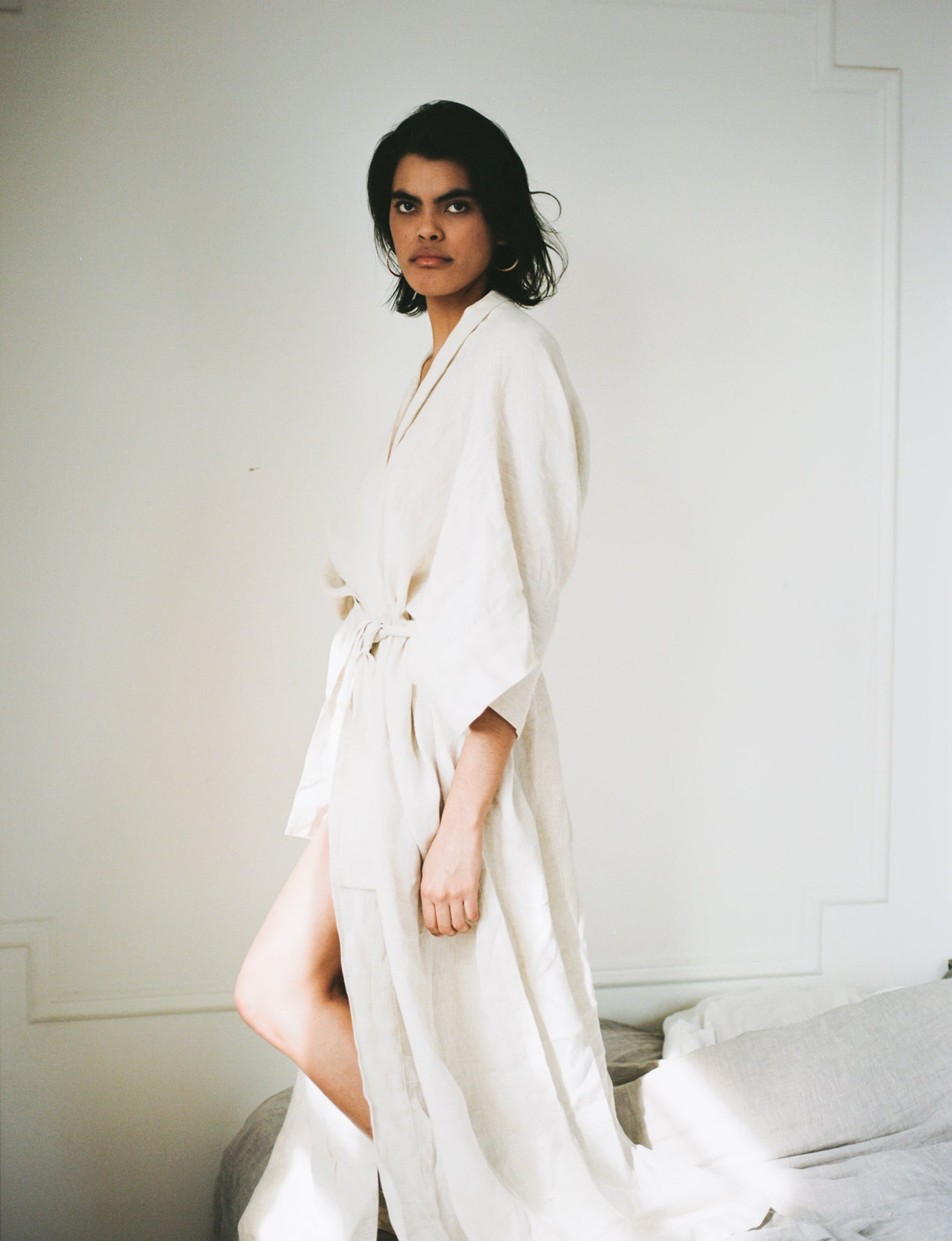 The Renaissance Robe is made from the softest linen that drapes and gathers beautifully around your curves. For slow mornings at home and perfect for breastfeeding mothers.