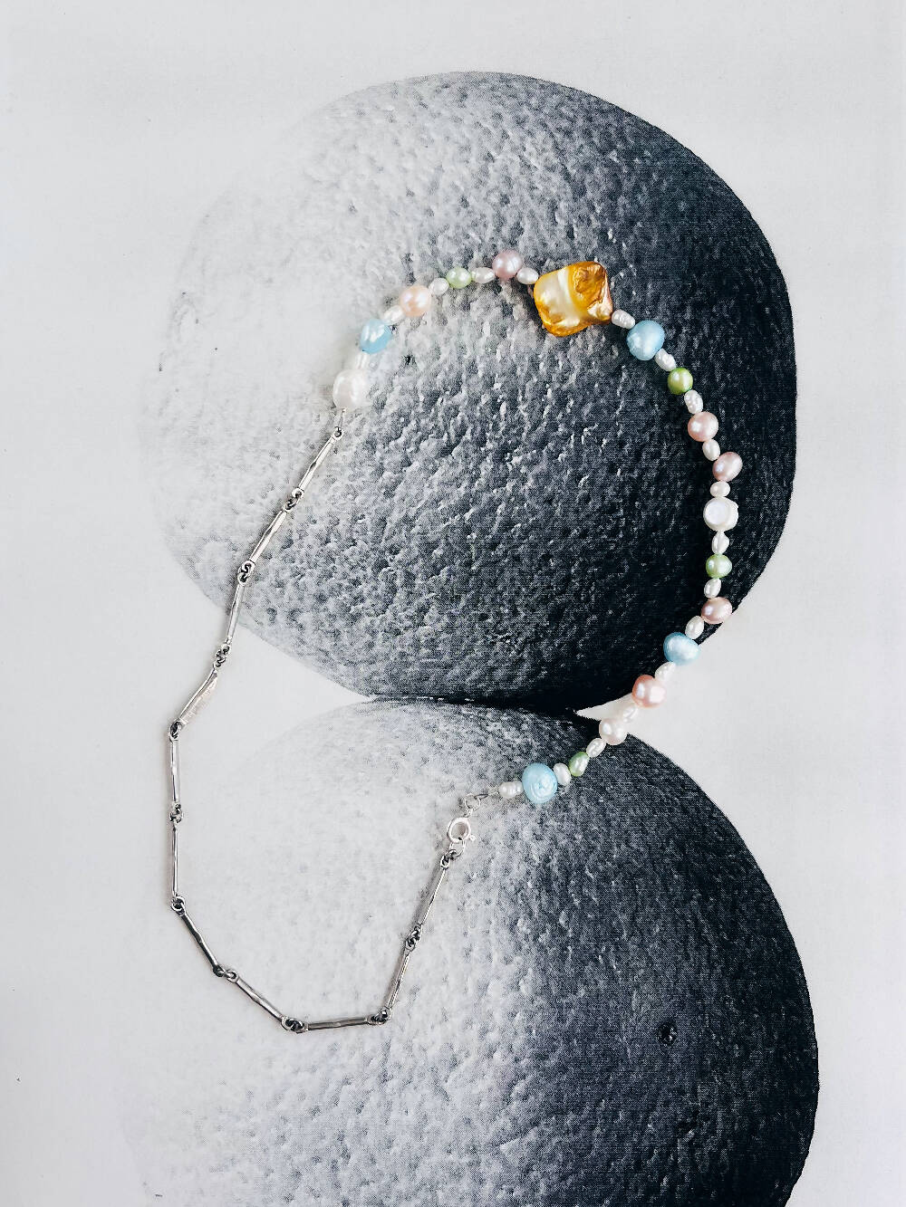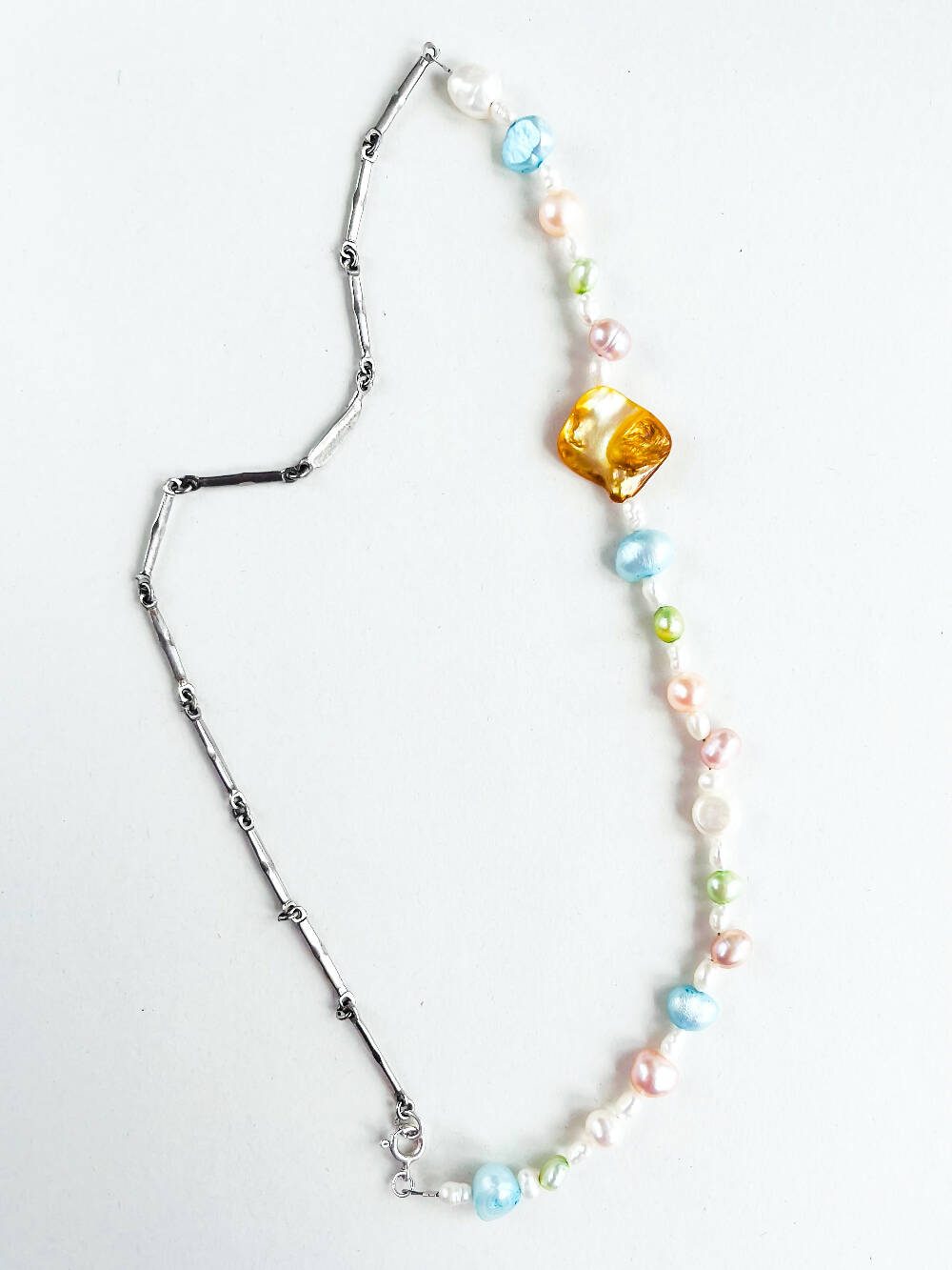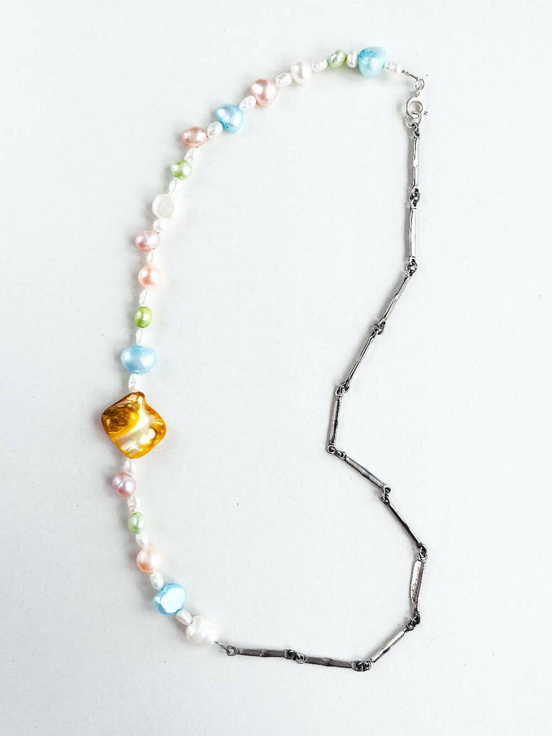 Materials: Shades of sweet water pearls. Antique metal chain. Wild shell.
