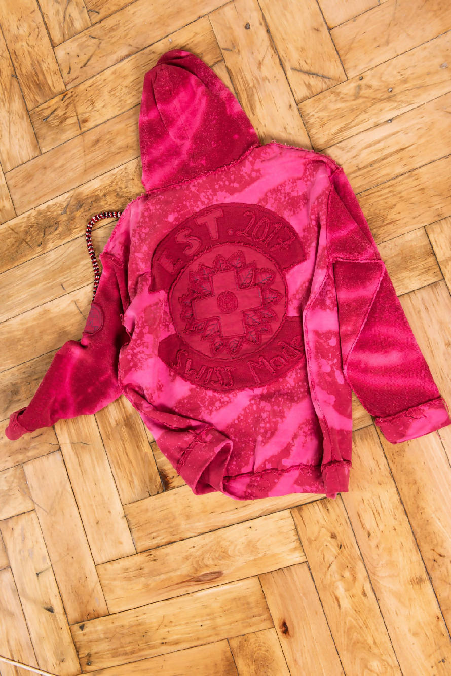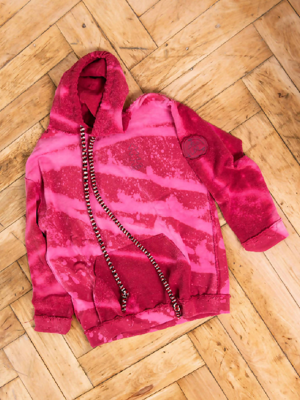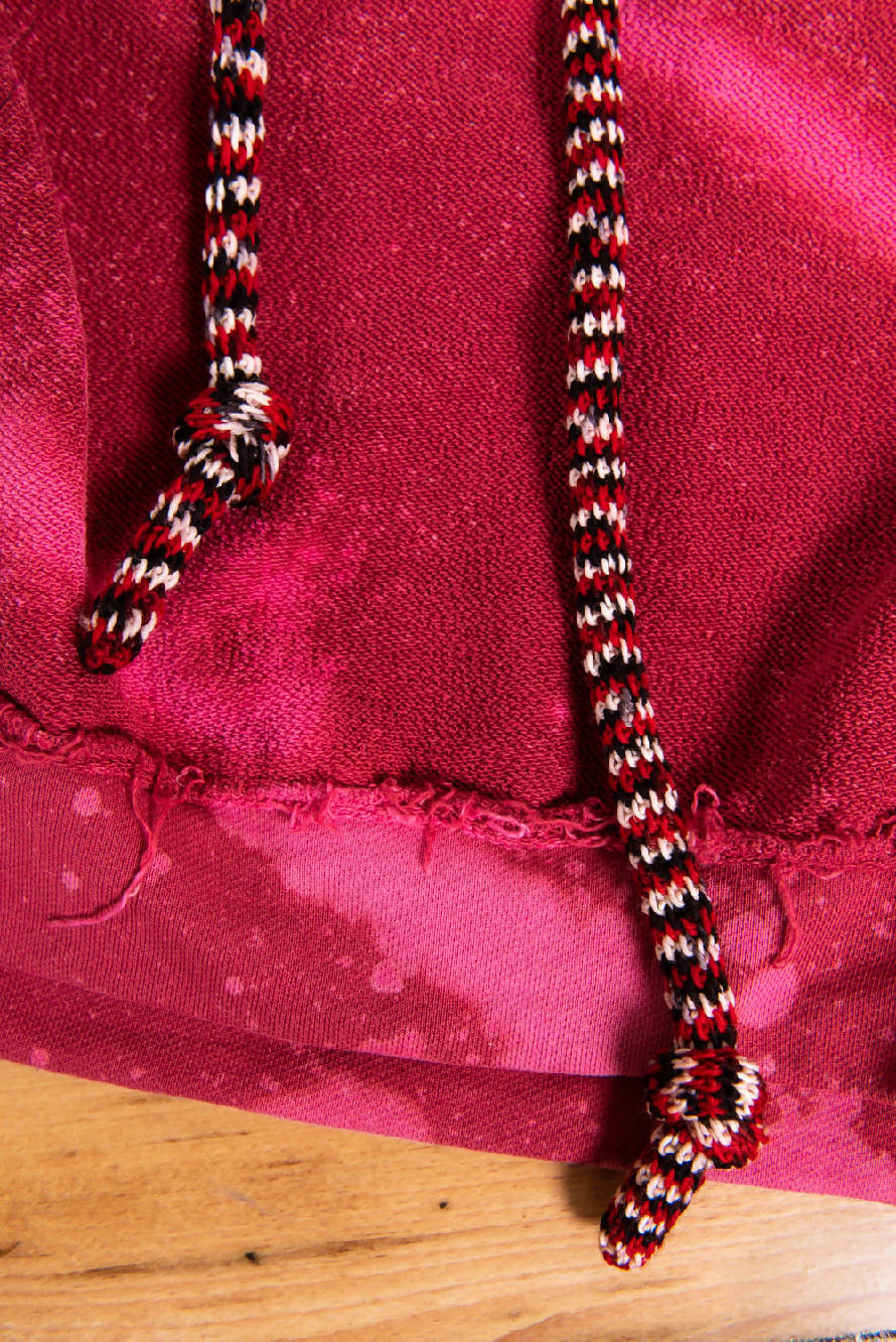 - Hand crotched drawstrings at hood. Each hoody goes through a hand-dying process using a water gun to alter the fabric’s original colour and to create lines.