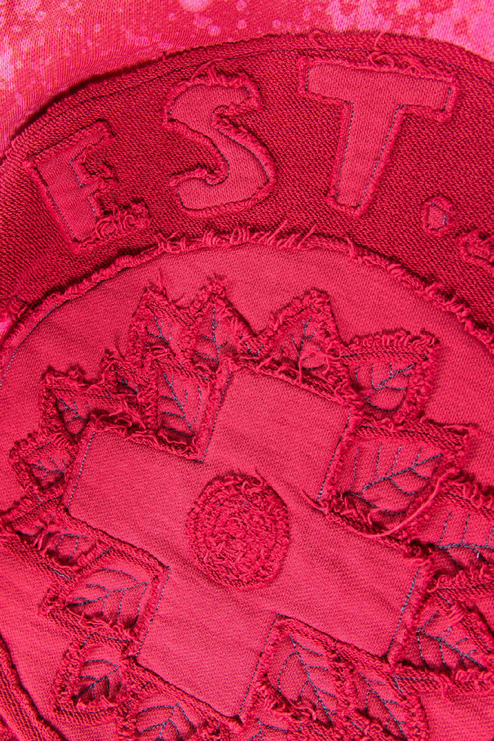 - Kangaroo pocket on the front. Big patch on the back using a cutout effect which leaves edges raw.