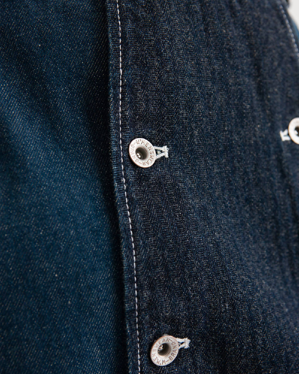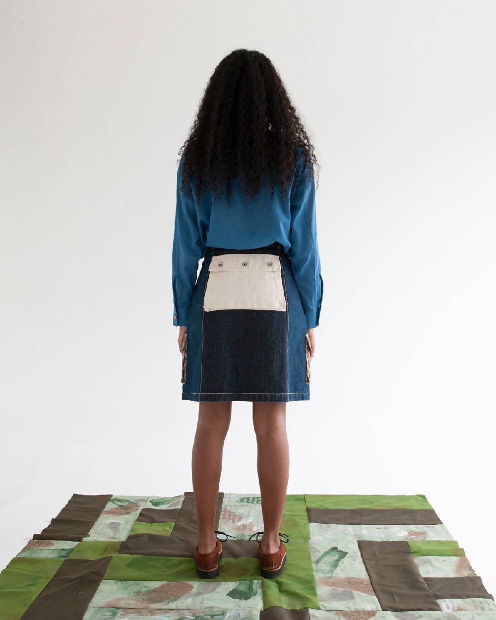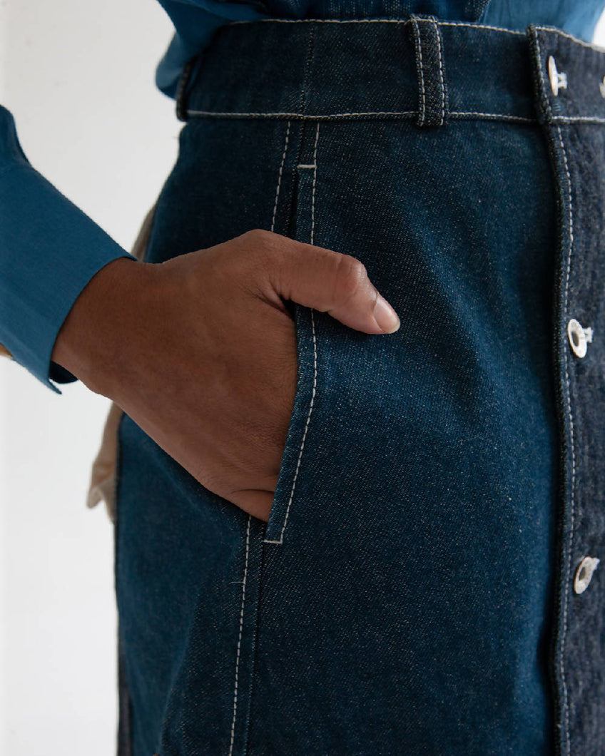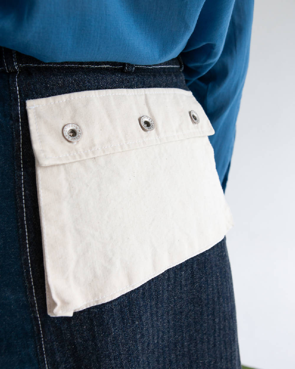 New to the W'menswear range this summer, the Landing skirt is our warm weather take on the See You Skirt, both based on the WWII monkey pant design. This rendition has been made in a Japanese double faced herringbone denim. Find the outside as a straight indigo denim, and the inside fully hickory striped!