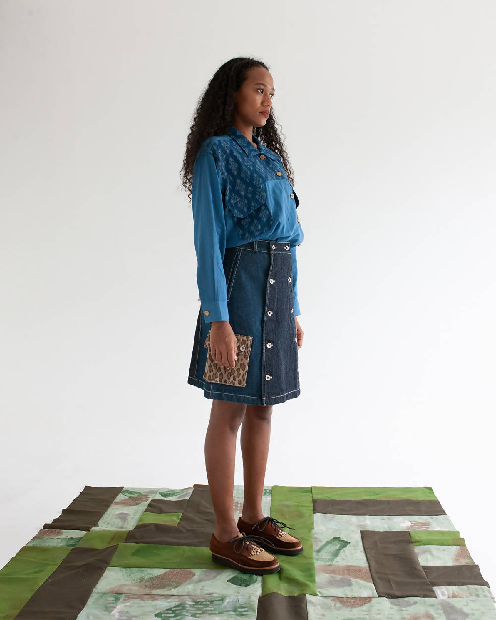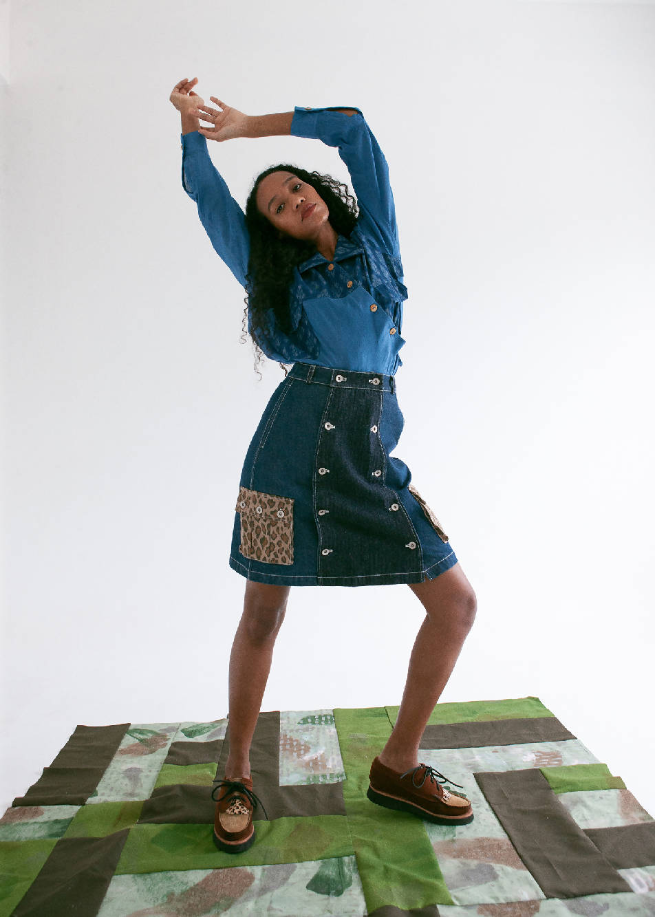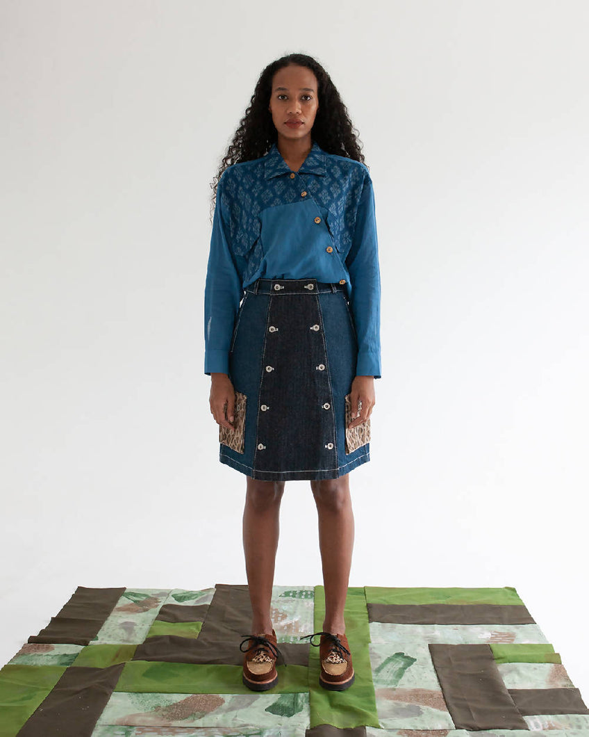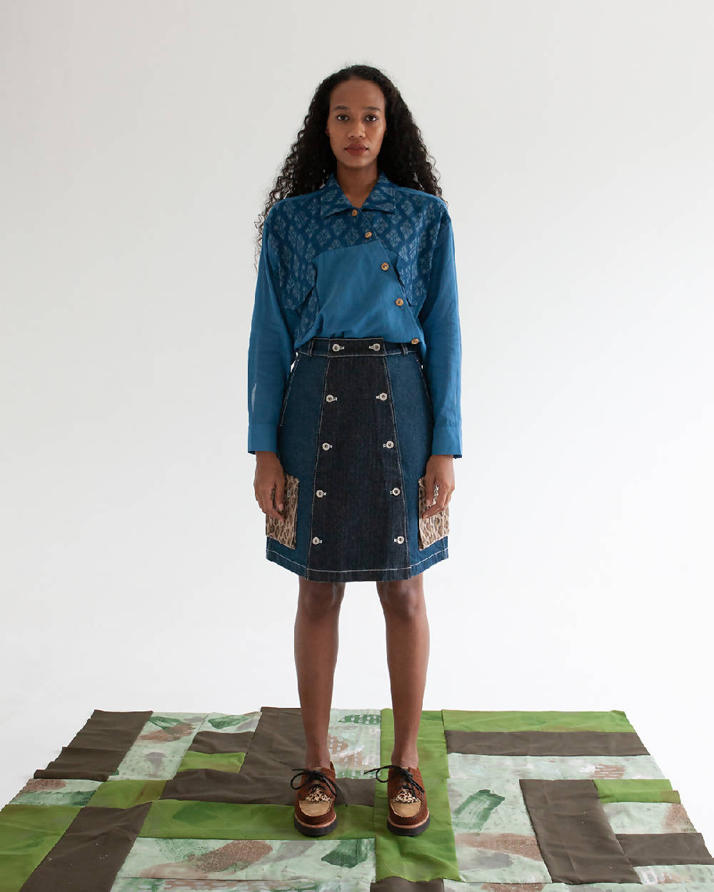 New to the W'menswear range this summer, the Landing skirt is our warm weather take on the See You Skirt, both based on the WWII monkey pant design. This rendition has been made in a Japanese double faced herringbone denim. Find the outside as a straight indigo denim, and the inside fully hickory striped!