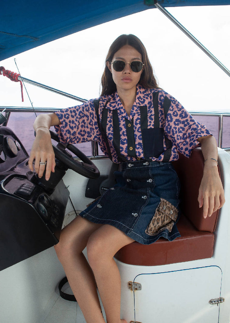 Each side pocket is made in a Japanese leopard print herringbone, and the monkey pocket on the bum is made in a vintage canvas.